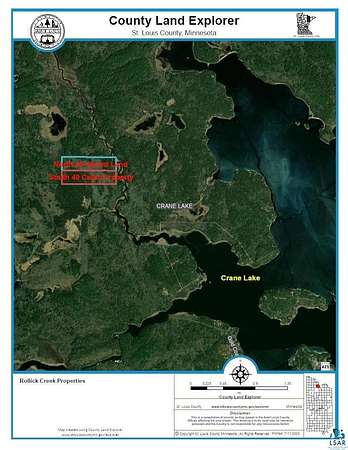 Crane Lake. 40 acres of boat/ATV access hunting land on Rollick Creek. 600+/- ft of shoreline giving you easy access to the federal land on either side of the river. Larger acreage parcels are hard to come by on Crane Lake. 40 private acres surrounded by 1000's of acres of state and federal land with an extensive trail system for hunting deer, bear and grouse, or to use as a base camp for playing up north or to build the perfect lake cabin/home/hunting retreat. A nice mix of tree cover and elevation with many building site options. The adjacent property to the south is also for sale and has power. Take an ATV ride from your property on the hundreds of miles of area trails or take a boat, canoe, kayak or snowmobile down the river to Crane Lake and explore Crane Lake, Voyageurs National Park, Canada and BWCAW and all the area has to offer.