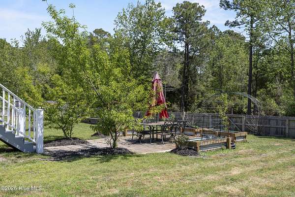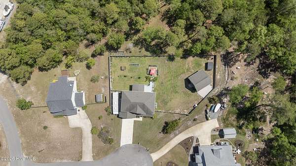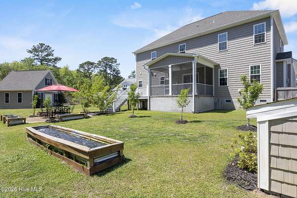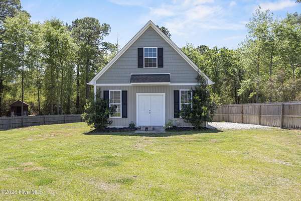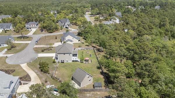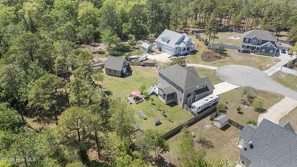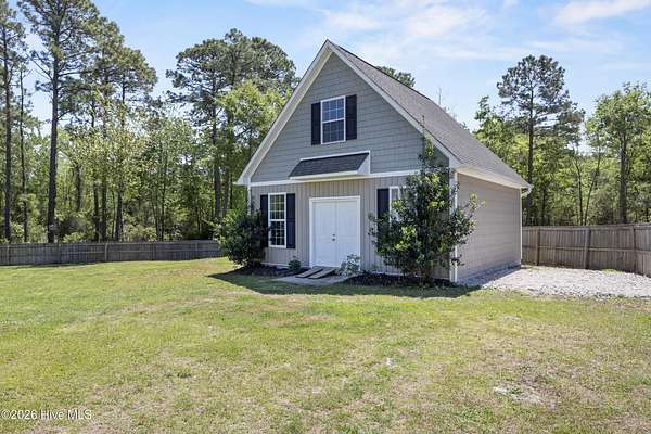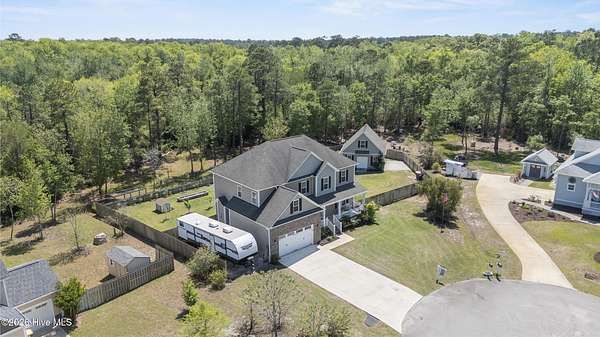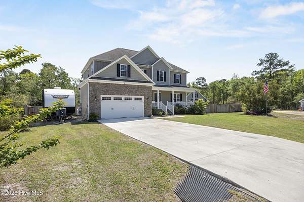 OPEN HOUSE SUNDAY 1-3PM *Interior photos coming soon* 1.5+ Acres | 4BR Home + Bonus Room + Workshop Nestled on a quiet cul-de-sac in Pinnacle Ridge, this rare property offers over 1.5 acres, providing privacy, natural views, and a peaceful setting. Built in 2019, this thoughtfully designed home offers over 2,600 square feet with 4 bedrooms, a bonus room and 3.5 bathrooms, including two primary suites. The main living areas feature durable LVP flooring, a cozy gas fireplace, and an open-concept layout ideal for both everyday living and entertaining. The kitchen includes abundant cabinetry, granite countertops, a true exterior-vented stainless steel range hood (not a recirculating system) and a dining area that flows seamlessly into the living room. The impressive upstairs primary suite serves as a private retreat with a sitting area and spa-like bath featuring a tiled shower with dual shower heads and bench seat, separate soaking tub with tile surround, dual vanity, and an oversized walk-in closet with built-in shelving. The upstairs also includes two additional spacious bedrooms, a large bonus room, guest bath with double vanity and tub/shower combo, a dedicated laundry room, and a walk-in attic for ample storage. A second primary suite on the main level provides excellent flexibility for guests or multi-generational living and includes a private bath with dual vanity and walk-in shower with bench seat. Step outside to enjoy the peaceful backyard from the screened porch or deck overlooking the large yard and wooded backdrop. The property extends well beyond the fenced area, offering additional privacy and usable acreage. Outdoor features make this property truly special. The fully irrigated front and back yard includes 20+ fruit trees (apple, plum and persimmons) as well as strawberries, blueberries, blackberries. Additionally, raised garden beds on a separate irrigation line are perfect for growing your own produce! Within the fenced backyard sits a detached 24x24 garage/workshop with a 24x14 loft that is fully heated and cooled and features a sauna, offering endless possibilities for hobbies, storage, or a private retreat. An additional open shed provides convenient storage for lawn equipment and outdoor tools. Beyond the fence line, the property continues with additional acreage featuring a charming custom-built mini cabin and plenty of open space for outdoor activities. Additional highlights include: - Tankless hot water heater - RV pad with hookup & boat/trailer parking area - Whole-house water filtration system - Tall, easy-access crawlspace - Skillfully planned grading to divert water away from the house and main yard Ideally located just 10 minutes from the beaches of Topsail Island, 5 minutes from the Intracoastal Waterway boat ramp, and within the highly sought-after Topsail school district. Properties with this much land, privacy, and flexibility this close to the coast are incredibly rare!
