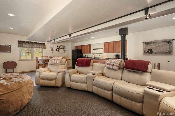 The finished walkout basement offers a cozy retreat with a wood-burning stove and a full wet bar complete with refrigerator and dishwasher—perfect for entertaining or relaxing after a day outdoors.