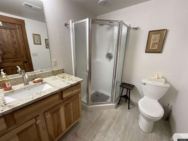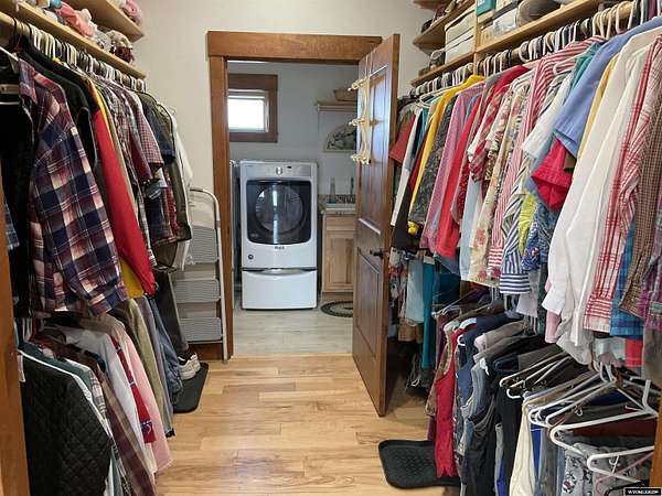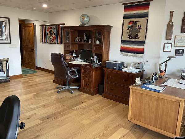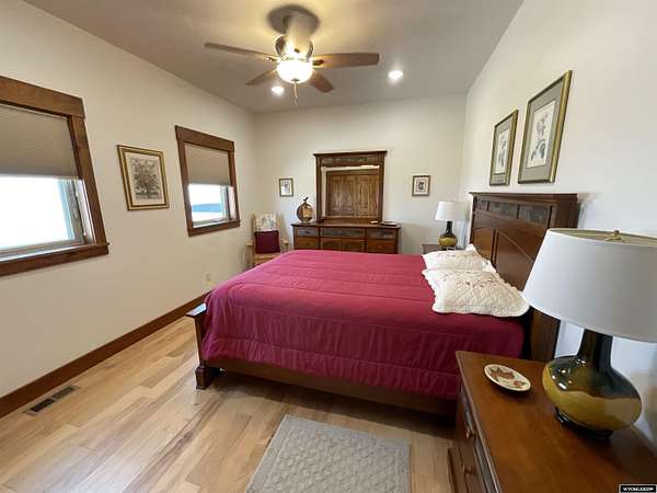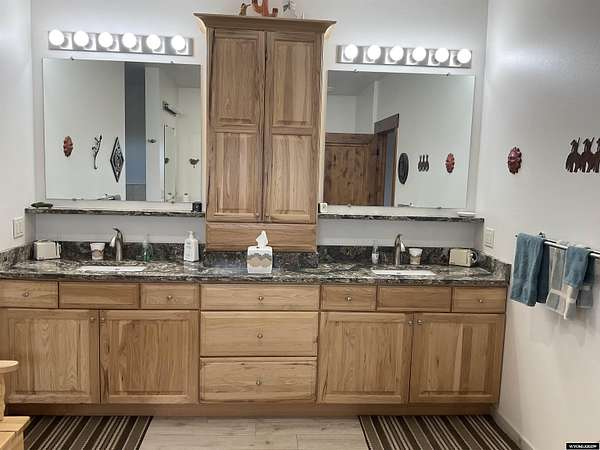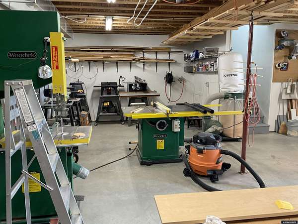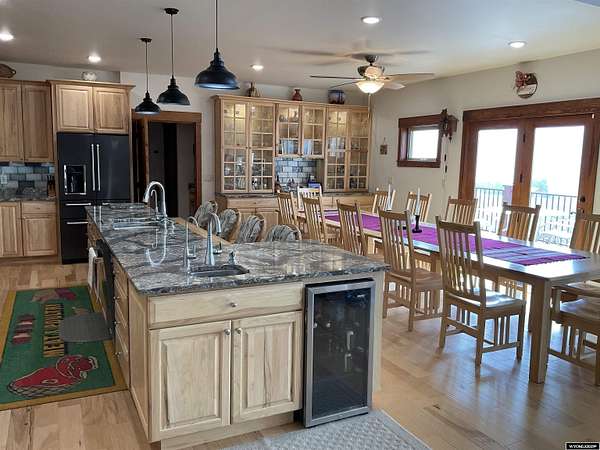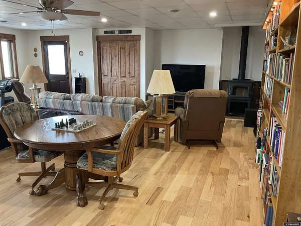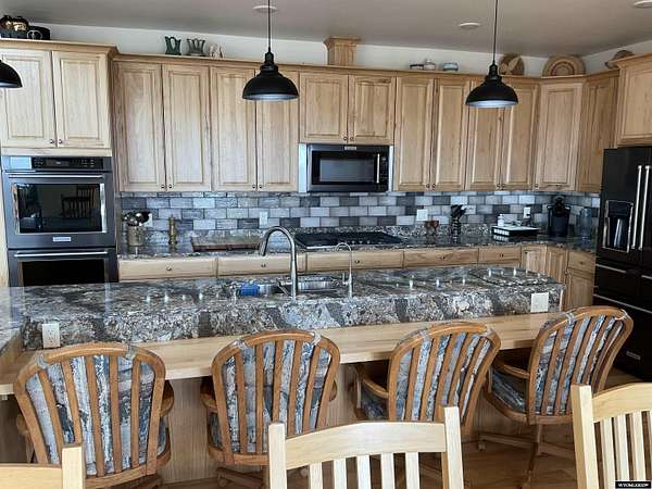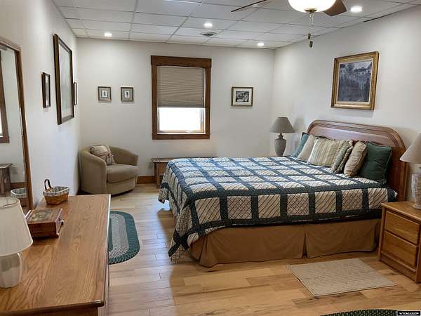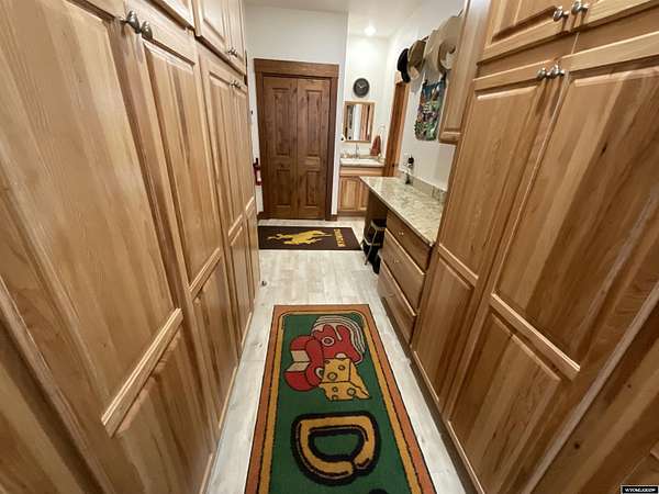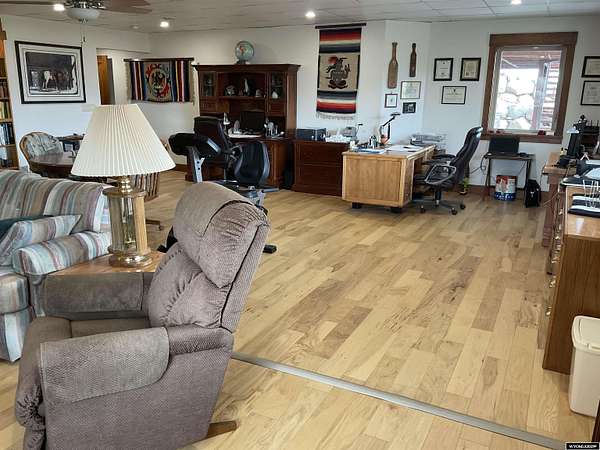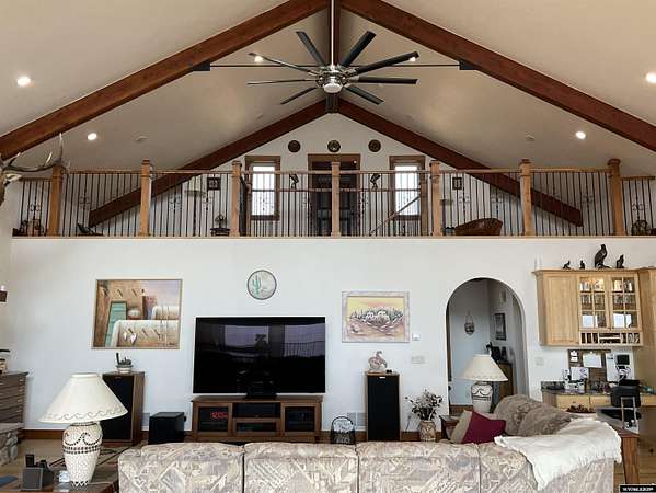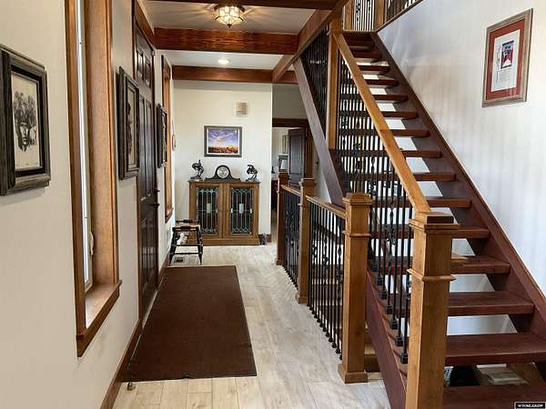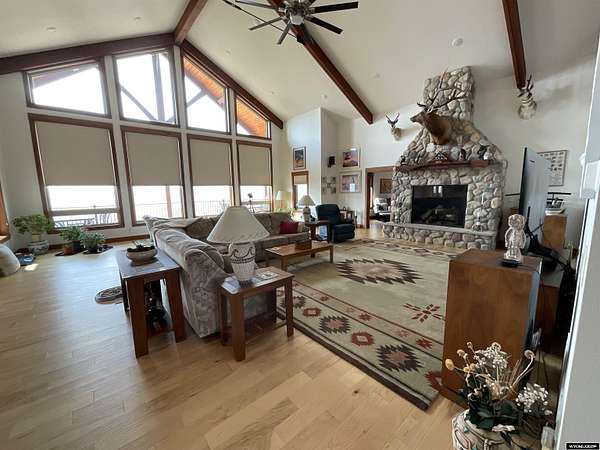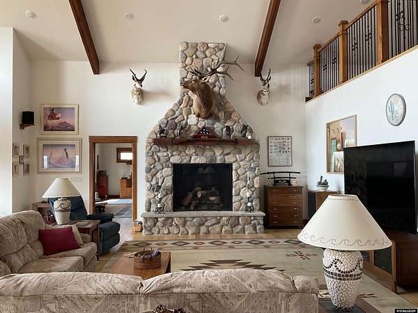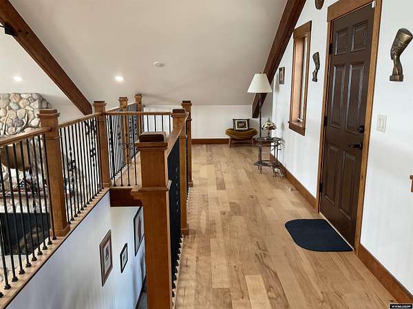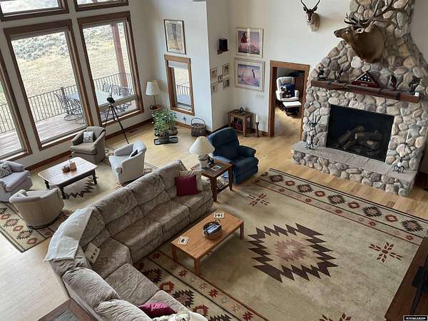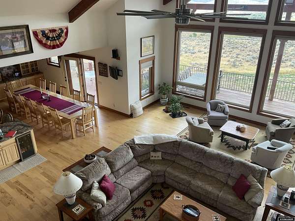Elk Run at Sinks Canyon Ranch is a custom-designed, custom-built timber frame style home of approx. 6,210 sq. ft. of quality construction. Perched on 35 acres overlooking valleys and mountains, it adjoins 440 acres of public land/school section which expands your enjoyment and privacy. Elk Run at Sinks Canyon Ranch captures 360 degrees of breathtaking views, while being just a few miles from city limits. Highlighted by vast windows and vaulted ceilings, the views also include various wildlife species. The home is high quality "Like New" condition throughout with unlimited storage, thoughtful details and conveniences such as Cat 6 Ethernet, a Great Room wired for Dolby 5.1 sound, engineered wood hickory flooring and porcelain tile, closed-circuit surveillance cameras, an alarm system, a detached observation deck, a whole-house reverse osmosis system for the private well, and a four-car heated garage with direct access to the woodshop and first floor. The large walk-in pantry off the beautiful "Chef's Delight" kitchen provides more than ample storage cabinets. Stepping into the beautiful entry hall and staircase, you are drawn into the stunning Great Room. This grand living space, with its large stone gas fireplace, provides lots of seating and gathering areas--either cozying up to the fire or gathering in front of the large span of windows overlooking Sinks Canyon and the Wind River Mountain Range. The open floor plan leads to the kitchen and dining area, perfect for entertaining or casual gatherings around the kitchen island/bar. Any cook will be delighted with the features in this well-equipped kitchen, which includes gorgeous hickory cabinetry, quartz counters that span large spaces, and quality appliances. The dining area, with a built-in hickory china cabinet, easily seats a crowd and provides access to this level's outdoor deck. The primary bedroom suite is found on this level. Among other amenities, the primary bath has a jetted tub, a fully tiled shower with stone accents and seating space, and double sinks on the vanity with plenty of cabinetry. A walk-through closet leads to the laundry room for convenience. A second bedroom and guest bath can be found as well. This entry level leads up to a third-floor loft area that overlooks and opens to the Great Room. The walk out level (labeled 1st Floor on floor plan) provides another full floor of square footage, made up o f two large bedrooms, a third bathroom, storage and hobby areas, plus a real bonus--a wood shop/workshop (approx. 585 sq. ft.) with an air filtration system and equipment. The seller would like to include most woodworking benches, major machinery, John Deere Gator/ with 6 ft snow blade, and John Deere Riding mower. The bonus room (approx. 853 sq. ft.) gathering room and office finish out this level, offering plenty of space for a theater room, game room, library, or office, complemented by a wood stove for cozy wintertime relaxing. This room has direct access to the outside patio and south yard.