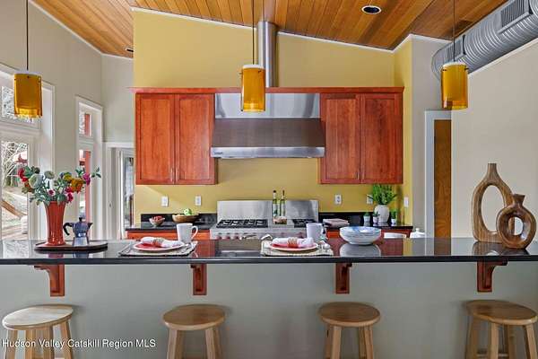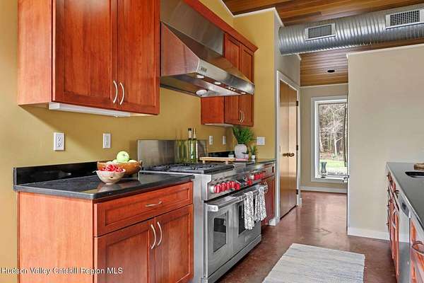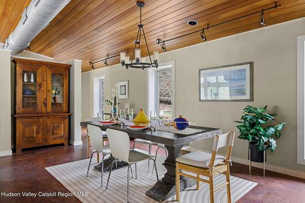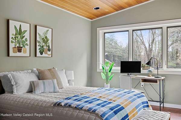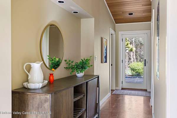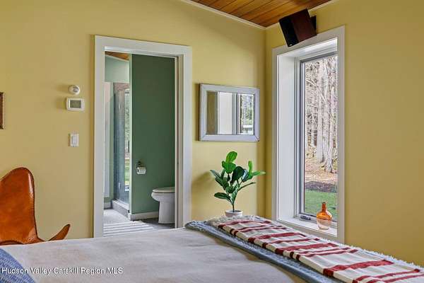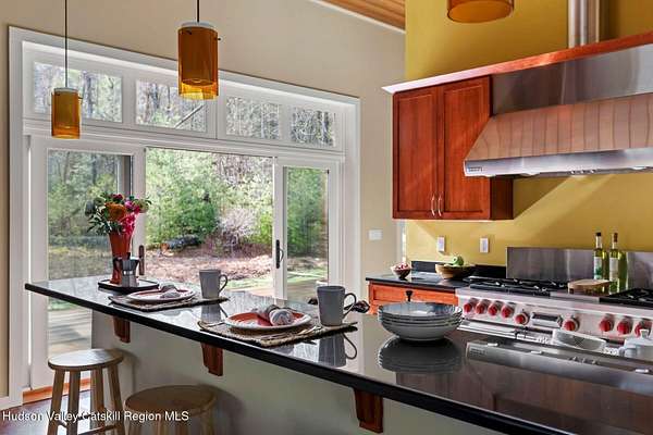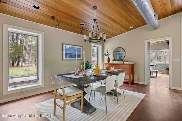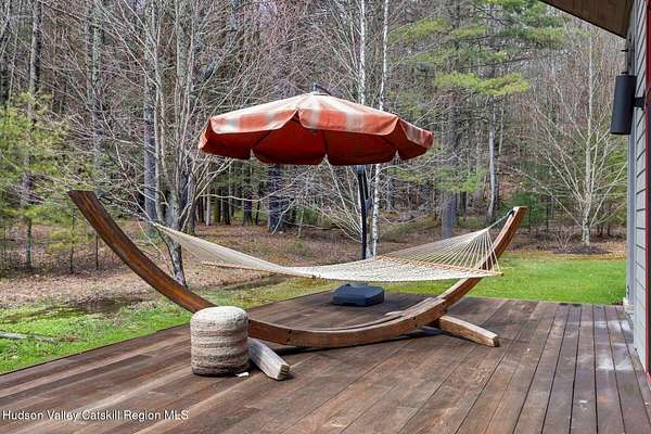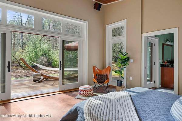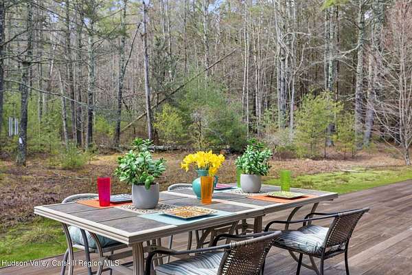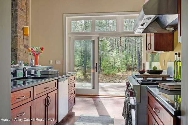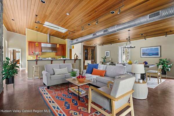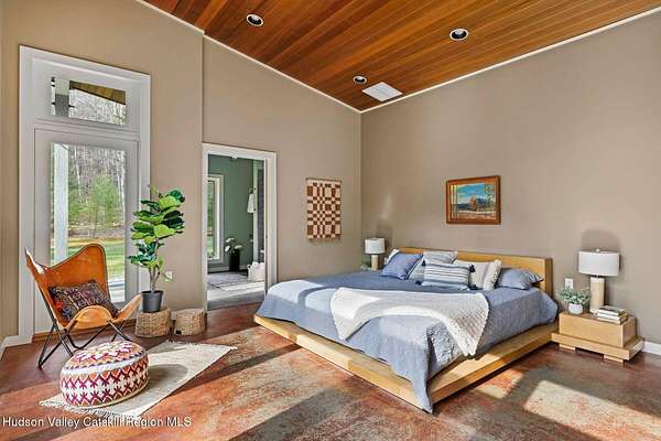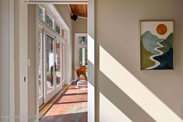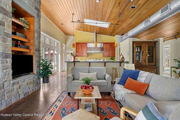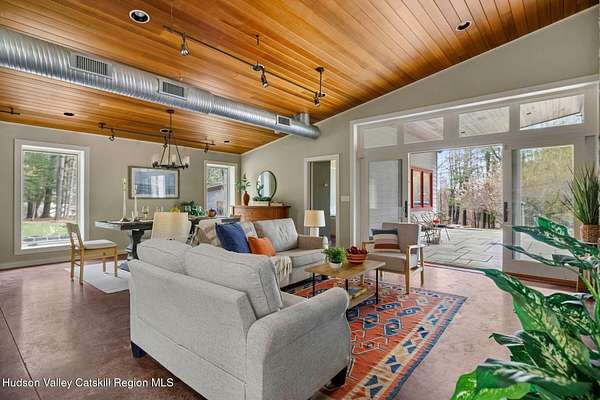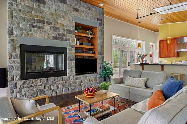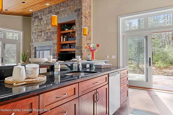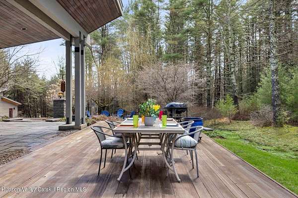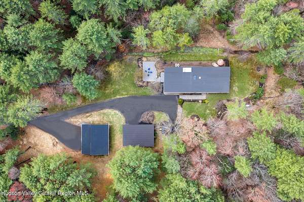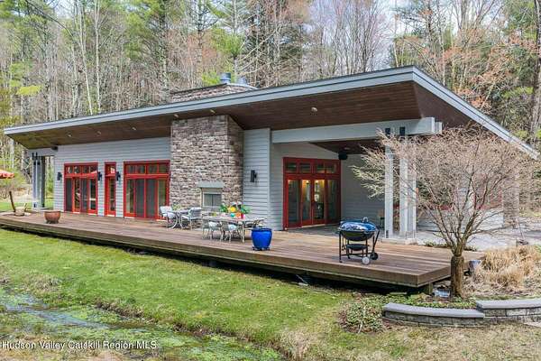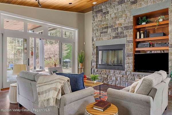 Designed with intention and sited with care, this stunning single-level home on Shultis Farm Road is one of Woodstock's most architecturally pleasing offerings. Commissioned from a noted architect and built for effortless and peaceful country living, the residence unfolds across three bedrooms and two and a half baths with an easy flow that opens naturally to the outdoors. Located in the Wittenberg area of Woodstock and toward the end of a dead-end street this home is totally private, has room to add a pool if one desires and is move-in ready. The interior is a serene experience with its polished concrete floors and expansive glass to take in the views. Warm wood ceilings bring a sense of intimacy and coziness to the distinctive clean lines of the home. A floor to ceiling natural stone wall with a double sided wood burning fireplace and built-ins is a central focal point of the inviting open plan living area. An expansive mahogany deck with its outdoor fireplace along with multiple bluestone patios are a true extension of the indoor living space - a gracious setting for al fresco dining, morning coffee, or quiet evenings listening to the woods and babbling stream on site. The grounds are beautifully landscaped, balancing cultivated garden with the wild beauty of the surrounding forest, offering both privacy and a deep connection to the natural landscape of the Catskills. What sets this property apart is the extraordinary pair of insulated and heated outbuildings that present a rare canvas of possibility. One at 1440 sq ft. the other at 1176 sq ft. Whether envisioned as a guest house, artist's studio, workshop, or home for a prized car collection, these versatile spaces elevate the property from exceptional home to complete compound. A short drive from the galleries, restaurants, and cultural energy of Woodstock village, this is a rare opportunity to own a piece of architecture that is as thoughtfully designed as the community it calls home. A 3D Walkthrough Tour is available in the digital Lookbook or by request.