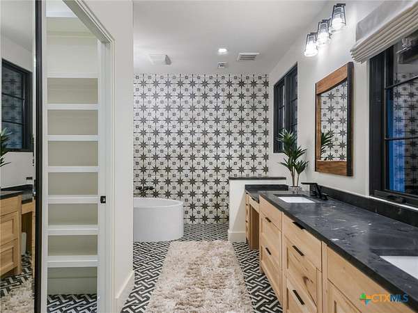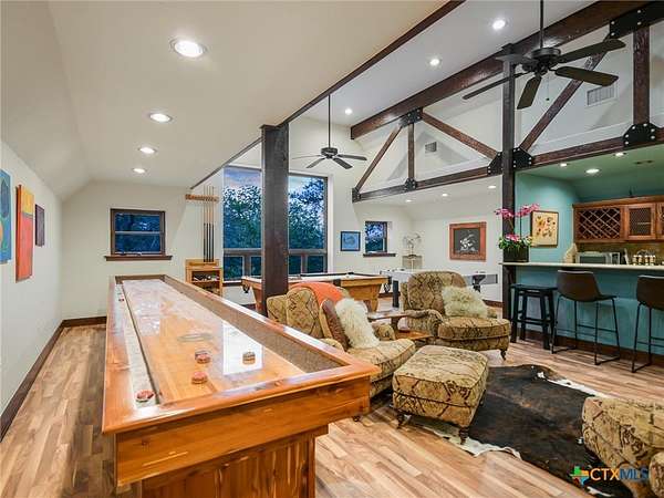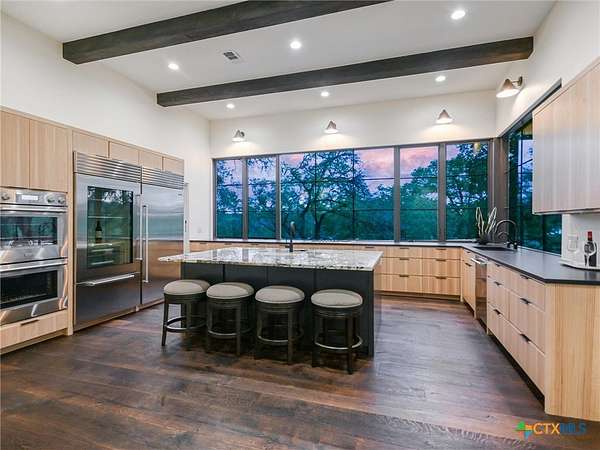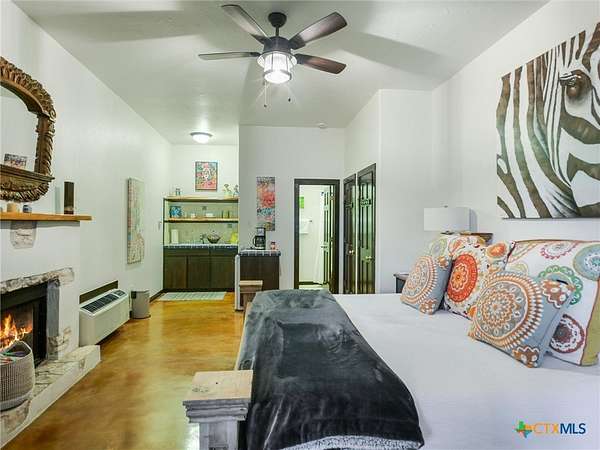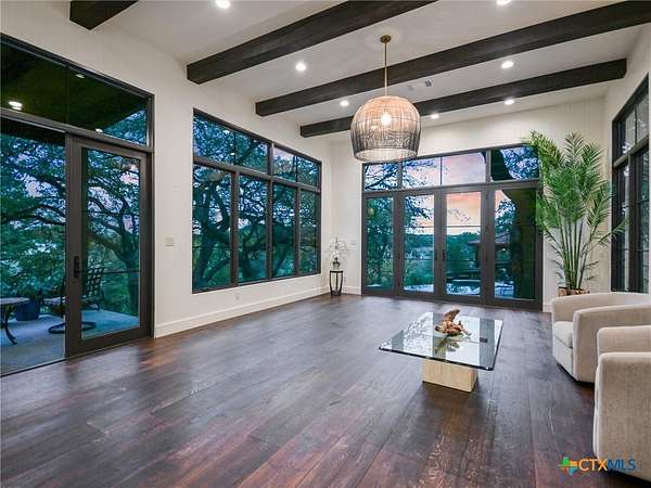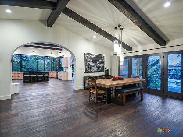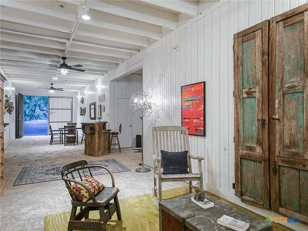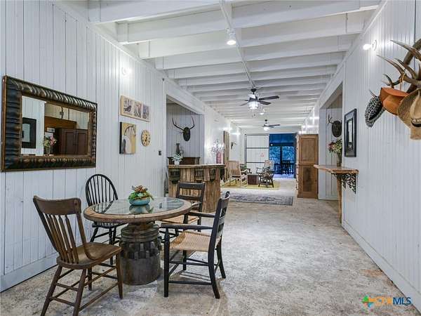 Discover an extraordinary private retreat located just minutes from the charming Wimberley Square. Spanning 22.83 acres, this estate boasts a stunning 740.5+/- ft of spring-fed Blanco River frontage, complete with gentle rapids, serene swimming hole and limestone coves; along with a spring fed creek-a true sanctuary with breathtaking natural beauty. The secluded main residence (3411sf), remodeled by Burnette Custom Builders, is finished with modern touches and features an infinity plunge pool overlooking the river, a covered pavilion with a fully equipped outdoor kitchen, outdoor fireplace and even a putting green. Entering the light filled home you discover the interior finished with wide plank hardwood floors, beamed ceiling and floor to ceiling glass taking in the views of the river. This unique home has 3 bedrooms, 3 full baths, 2 half baths, office, a roomy laundry room equipped with a dog washing station and plenty of storage, and an attached 2 car garage. The 2 guest bedrooms each have their own entrance and ensuite baths accessed via a covered breezeway. For guests, the spacious lodge offers 4 unique suites, each with its own private entrance, fireplace, kitchenette, en-suite bath, and covered porch. The lodge, styled after a classic barn, also includes a central gathering space with charming barn doors that open to allow for an indoor-outdoor flow. Upstairs, a large game room with a bar, kitchenette, and half bath offers a perfect entertainment area. Additional property features include a 950-square-foot detached studio, a two-car garage with an attached workshop, a 3-stall barn, perimeter high fencing with cross-fencing, and secure electric gated access. With underground utilities and a blend of privacy and elegance, this estate offers an unrivaled riverfront lifestyle in the heart of the Texas Hill Country. Can subdivide into 7ac tracts.