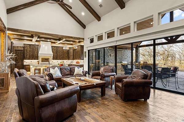 This extraordinary custom estate offers the perfect blend of luxury living and natural beauty,nestled among mature trees on over 49 pristine acres.The magnificent main residence spans more than 6800 sqft,featuring sophisticated design elements including cathedral ceilings,exposed wood beams and hand-scraped hardwood floors throughout.The main residence features a distinctive stone exterior with two elegant fireplaces creating warm and inviting spaces to gather.The kitchen is open to the living room and has a built-in fridge freezer, walk-in pantry, double ovens and spacious island.The outdoor patio is off the kitchen and has a wall of sliding doors for natural light.The primary suite is spa-like with dual vanities, soaking tub, multiple shower heads and 2 walk-in closets.The family room invites you to host guests at the wet bar with dedicated seating perfect for entertaining. Laundry features tons of storage, dog bath and space for double washer and dryer.Home also has a safe room.The estate's covered outdoor space rivals its interior amenities with an integrated speaker system, cooling fans, heaters, built-in grill, sink, fridge, bar area along with strategic landscape lighting. Over 2024sf of outdoor living. Attached by a porta cachet is a luxurious guest quarters with an attached garage.Separate 2B, 1B, cabin provides perfect accommodation for guests with privacy while maintaining proximity to the main residence.The 6 garage spaces have HVAC and around 2266sf.Property is ready for your livestock and horses with 10 separated pastures,10 loafing sheds with electric and water,10 working pens with water and shade coverage, large covered shed 60x25,equipment shed 15x20,hay shed with electric and a chicken house.There is also a 30x60 shop with HVAC, full RV hookup with water,electric,and sewer connections.The property has 2 entrances and a perfect location for your dream arena.We have a bid for a proposed arena that is 250X250 with stables.45 minutes to DFW airport.