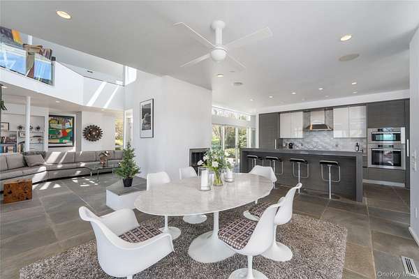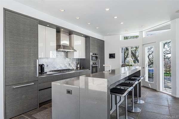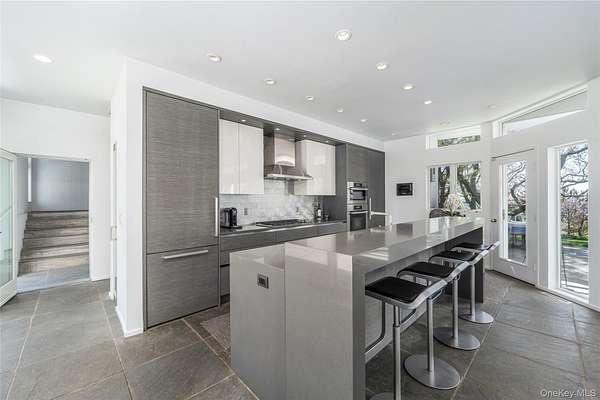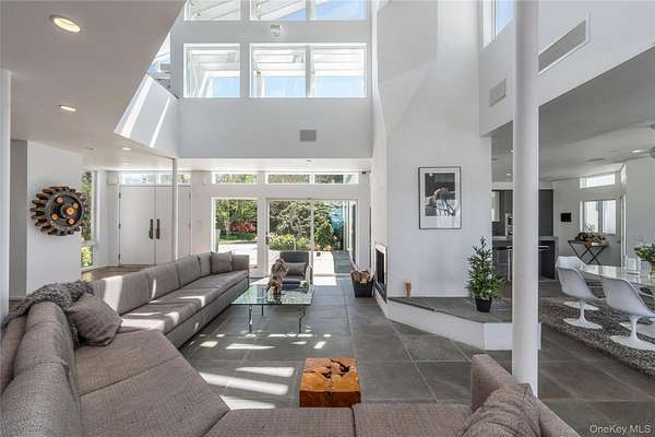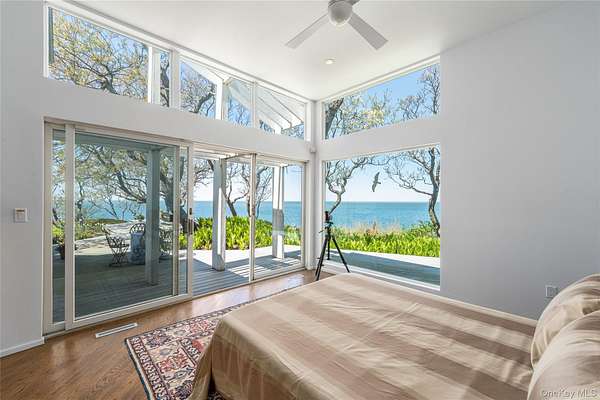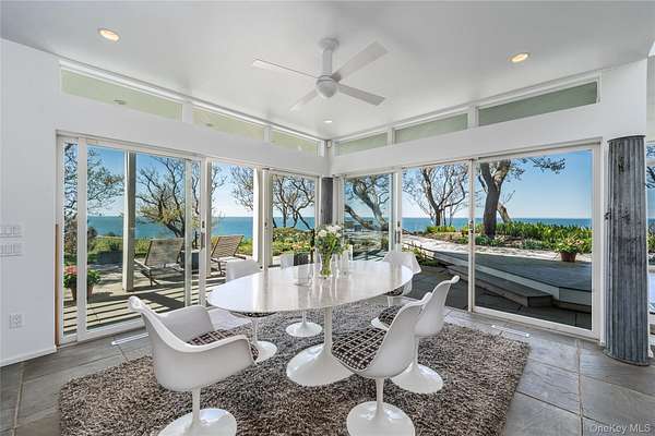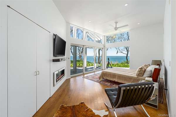 Perched on a 100-foot-high bluff with commanding views of Long Island Sound, this exceptional 3 + bedroom, 5 bath contemporary home is a rare fusion of design, privacy, and natural beauty. Originally designed and built in 1986 by architect Sanford Hanuer for his own use, the 3,348 sq ft residence was completely reimagined in 2011, preserving its architectural integrity while introducing luxurious modern updates. Set on 2.45 acres with 190 feet of private beachfront, the home is sited at an angle to capture uninterrupted water views from every room. Floor-to-ceiling windows, bluestone and wide ash plank flooring, and three fireplaces create a warm yet sophisticated interior. The Eggersmann-designed kitchen with butler's pantry is a chef's dream, and the home's layout includes a loft and multiple decks and patios ideal for seamless indoor-outdoor living. The white-stained cedar exterior blends harmoniously with the surroundings. Below the home, a 50-foot pool with lanai and expansive deck is tucked 10 feet down the bluff, preserving both privacy and unobstructed views. Two + bedrooms are sectioned off to serve as a separate guest cottage. Every inch of this property has been thoughtfully designed to elevate the art of waterfront living - from floor to ceiling windows, white Italian marble bathrooms to golden-hour dinners on the patio overlooking the Sound. This is not to be missed!