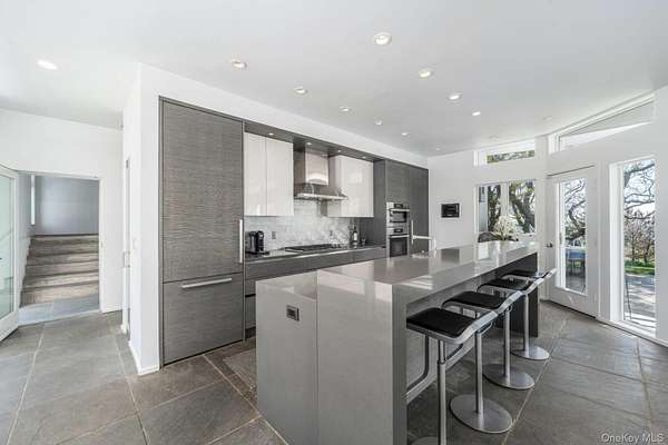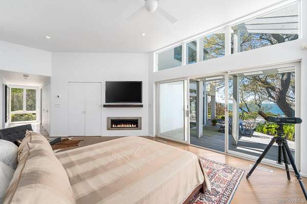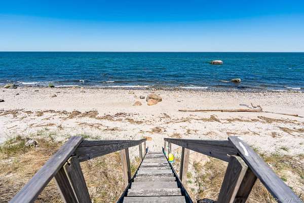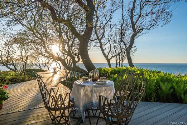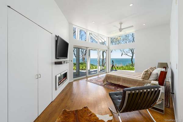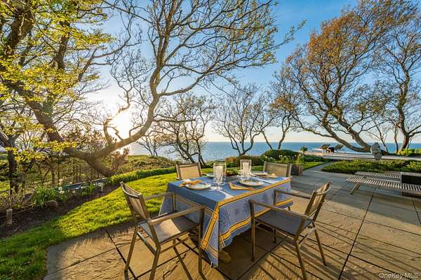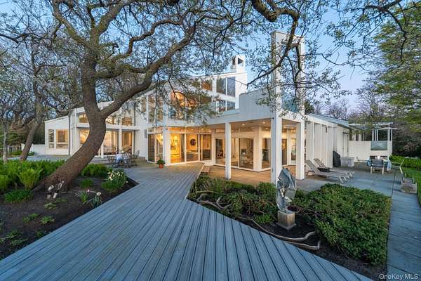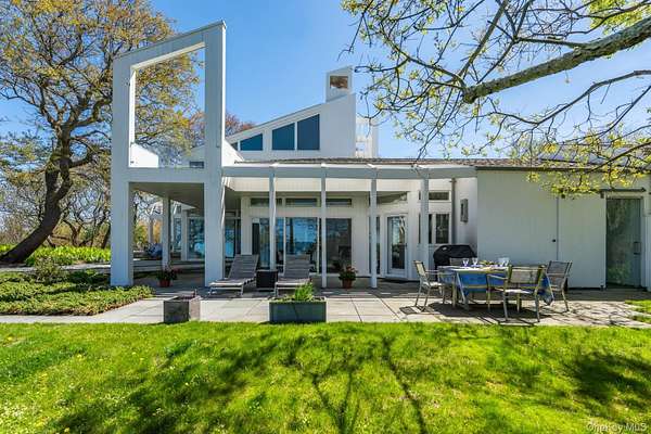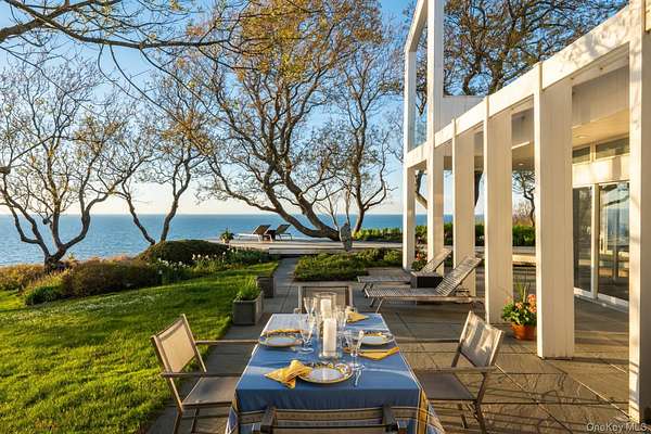 SOUND FRONT RETREAT - Designed in 1986 by architect Sanford Hanauer for his own residence and reimagined in 2011, this elegant homestead is modern luxury done the right way. Set high above the shoreline on 2.45 acres with 200 feet of direct beachfront, angled so the water is the constant-nearly every room, every day, every season. Floor-to-ceiling glass pulls in the light, while bluestone accents, wide ash plank floors, and three fireplaces keep it warm and grounded. The Eggersmann kitchen with a butler's pantry is as timeless as it is functional, ready for quiet mornings, long lunches, and the kind of dinners that start at golden hour and somehow become tradition. Outside, the 50-foot pool is set discreetly into the bluff-private, protected, yet open water views. Two additional bedrooms are positioned to work like a separate guest cottage-ideal for extended stays or flexible space for work. A loft, multiple decks, and sun-soaked patios make indoor-outdoor living feel natural-because here, the view is the backdrop to everything. The white-stained cedar exterior blends seamlessly with the landscape. From white Italian marble baths to that last ray of sunset on the patio as the sky turns soft over the Sound, this is a home designed to inspire and never lose power with a full house generator.