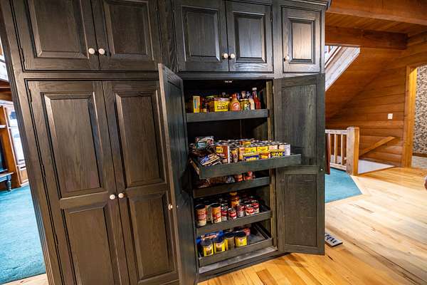 Gourmet Kitchen: Custom oak cabinets with intricate leaf cutout details, complemented by lifetime Corian countertops and walnut hardwood floors. Features include a large island, a huge custom pantry cabinet, turntable corner cabinets, and gas/electric stove hookups.