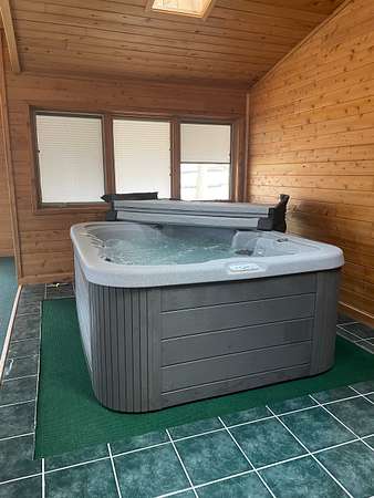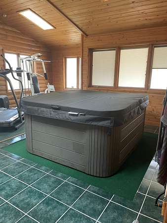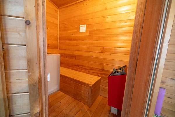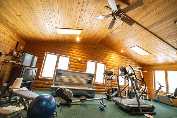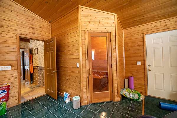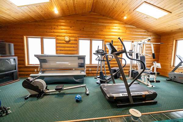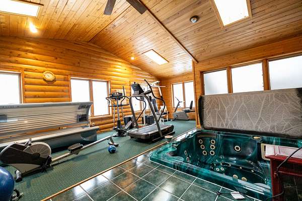 Exercise Room: Designed for ultimate relaxation, this space includes a hot tub, sauna, and tanning bed, with large windows offering tranquil sunset views over the pond.