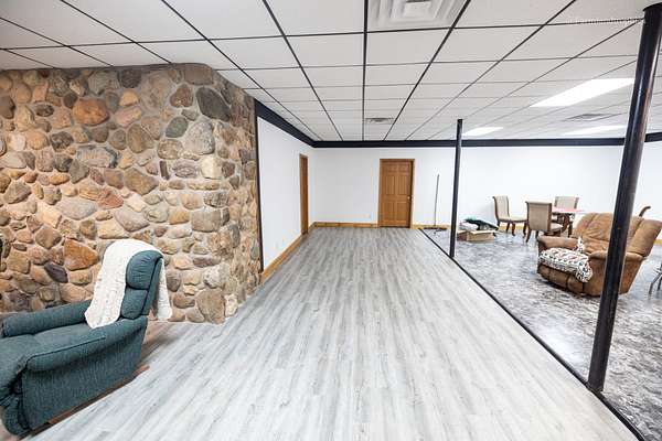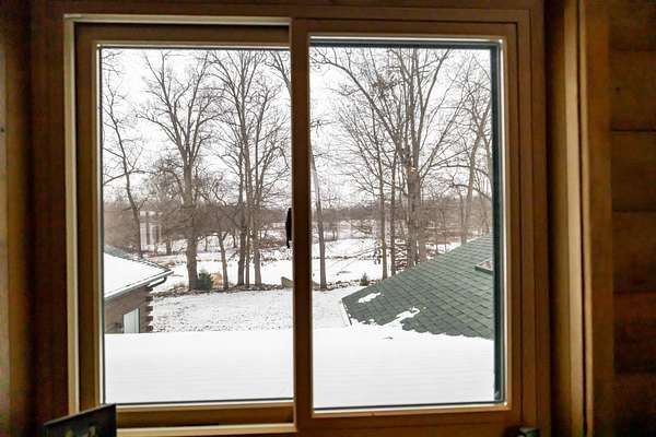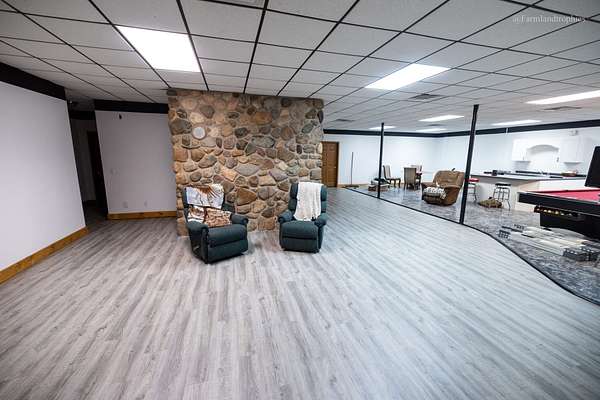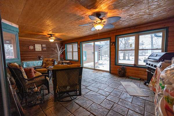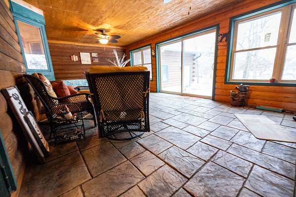 Living & Dining: Brand new flooring in living room! The open-concept layout is perfect for entertaining, with a dining area and a 4-season room featuring a custom-stamped floor and panoramic pond views. The living area showcases a striking floor-to-ceiling fireplace built with locally sourced stone, flanked by east-facing windows that capture breathtaking sunrises.