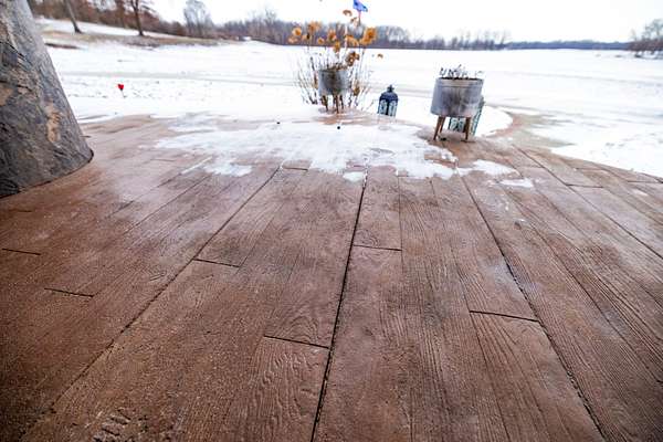 Exterior: A covered patio with custom wood-stamped concrete, perfect for outdoor gatherings. 7-8 year old roof. Gutter guards on all gutters.