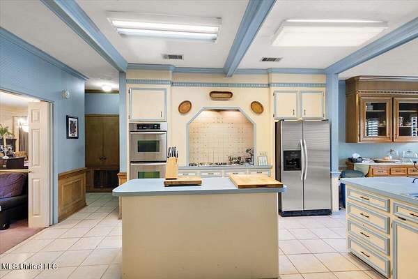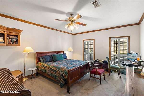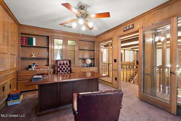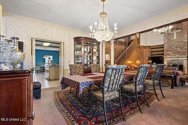 This exceptional estate is a rare offering-an architectural statement set on approximately 4.5 private acres, where classic Southern design meets enduring craftsmanship and impressive scale. From the stately brick facade and columned front elevation to the privacy and presence created by the expansive grounds, this home immediately commands attention. Inside, dramatic living spaces are defined by soaring ceilings, rich ash woodwork, detailed wainscoting, and a commanding brick fireplace anchoring the great room. A sweeping staircase and upper-level interior balcony add architectural depth, while natural light highlights the warmth and character throughout. The layout flows effortlessly, ideal for both large-scale entertaining and everyday living. The kitchen and adjoining breakfast room provide generous space and functionality, enhanced by custom cabinetry and a built-in china cabinet that reinforces the home's timeless appeal. Multiple living and dining areas offer flexibility and comfort while maintaining a seamless connection across the main level. A standout feature of the home is the executive office, wrapped in rich custom wood paneling and outfitted with built-in shelving, cabinetry, and glass-front display cases. Designed for both form and function, the space includes a substantial executive desk and overlooks the interior balcony, offering privacy without isolation-an exceptional and rarely found residential workspace. The primary suite serves as a private retreat with generous proportions, a massive en-suite bath, and two walk-in closets, delivering comfort and practicality without compromise. Additional spaces include a furnished game room with wet bar, a laundry and craft room with extensive built-in cabinetry, and thoughtful storage throughout. Major system updates include a new roof installed October 2019, a tankless water heater, and three HVAC units, with recent replacements providing peace of mind. Outdoors, the property continues to impress with mature landscaping, wide-open views and additional structures for storage and flexibility - offering privacy, space, and versatility rarely found in today's market. This is a home defined by scale, craftsmanship, and lasting quality an opportunity that stands apart and is not easily replicated.