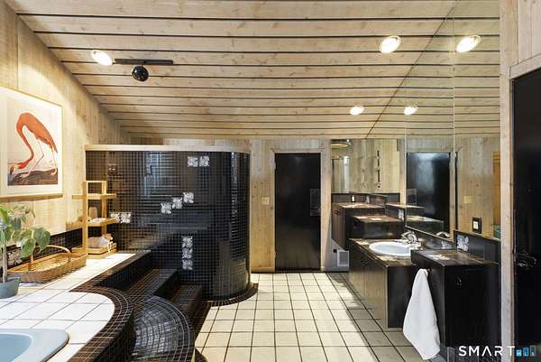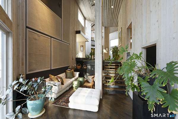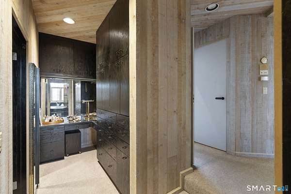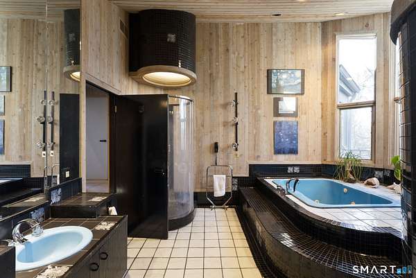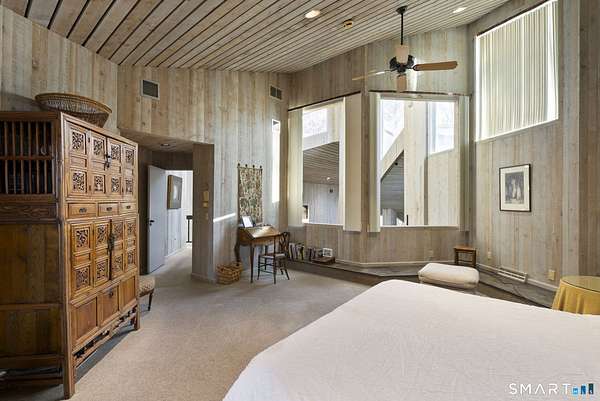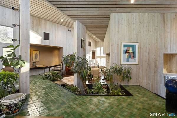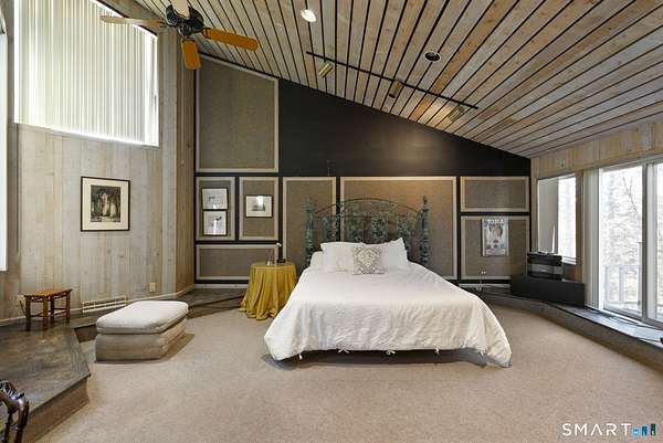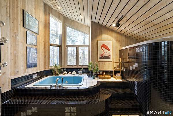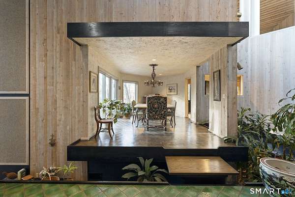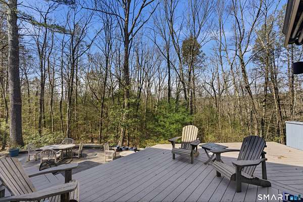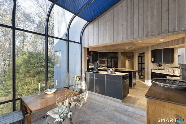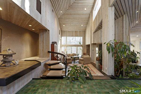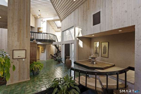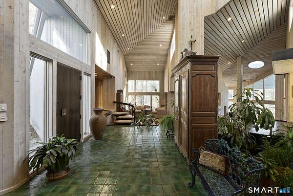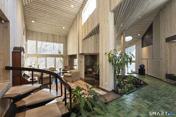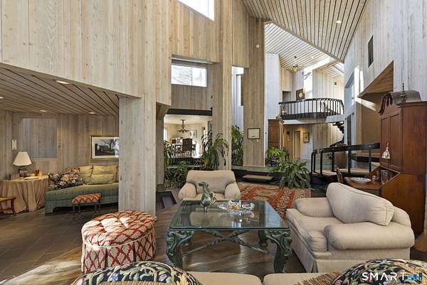 Custom-built, architecturally distinctive post-and-beam contemporary, set on 10+ private acres. A long driveway through the woods leads to a circular drive, where you are greeted by a massive, sculptural front door that serves as both entrance and art. For those who appreciate bold architecture, the home is defined by expansive use of wood, glass, and soaring ceilings, establishing a deep connection between the home and its natural setting. The open concept is unconventionally divided into artfully defined spaces without disrupting flow, using purposeful angles, sunken gardens and level changes to create conversation pits, dining areas, and quiet places to read or relax. Thoughtful design also makes this home an incredible place to entertain, whether an intimate group or large crowd. Sculptural, artistic details carry into the kitchen and baths, where bold design choices, authentic to the era, reinforce the home's confident, creative spirit. Bedrooms provide privacy and flexibility. An area separated from the main living spaces, features two rooms connected by a shared bath, currently used as a bedroom and an office, which could easily serve as a third bedroom. The upper level is devoted to the primary suite, featuring a spacious bedroom, generous closet storage, and an unique primary bath, designed for both function and visual interest. Multi-level decks, and a Goshen Stone patio offer varied vantage points and and a seamless relationship between architecture and nature.