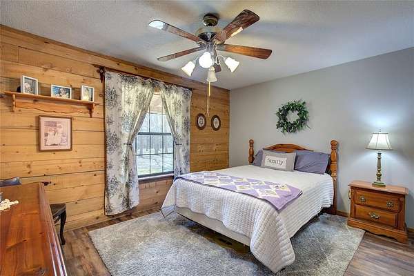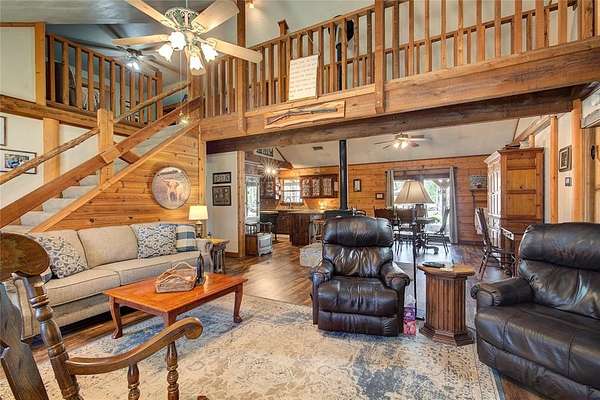 Secluded one owner home near LAKE FORK! As you turn onto the private, winding drive of your 5.295 acres, a canopy of mature hardwoods welcomes you home as you pass your own pond shimmering in the sunlight. Tucked beyond the trees is the timeless appeal of this stunning 4 BD 3 BA luxury Satterwhite Log Home constructed of Engelman Blue Spruce logs.