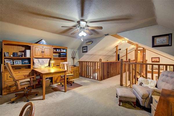 Upstairs, a lofted walkway overlooks the living room below. Bedroom 3 includes ensuite bath and walk-in closet. Across, a loft space makes an ideal office or playroom, and a spacious bonus room with closet can serve as a 4th bedroom or hobby space. A large laundry room with pantry space is off the oversized two-car garage that provides extra storage and hobby space. Two additional outdoor buildings have more storage.
