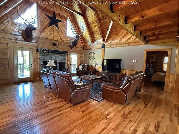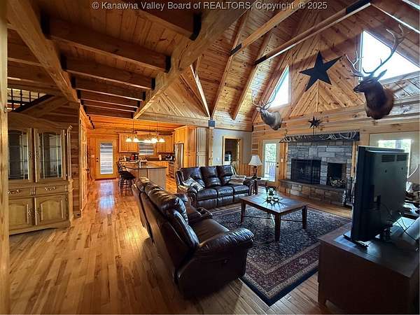 This magnificent 3,456 sq ft log home is nestled within a sprawling 512+/- acre estate with significant timber, offering both luxurious living and untamed natural beauty. This residence boasts an open floor plan, hickory floors and cabinets, 3 bedrooms, 2.5 bathrooms, and a cozy fireplace, all designed for comfort and elegance. Step outside to a wraparound porch, perfect for savoring breathtaking ridgetop views. The convenient 2-car detached garage with breezeway and the essential home generator for uninterrupted peace of mind. Beyond the home, the property unfolds into a diverse landscape, featuring 30+/- acres of pasture, a 60'x40' building with heat and water, and a trail system ready for exploration. 170+/- acres of wetlands are part of a stream mitigation bank controlled by the Nature Conservancy. Give the listing agent Jeremy Allen a call with any questions or to set up your private tour.