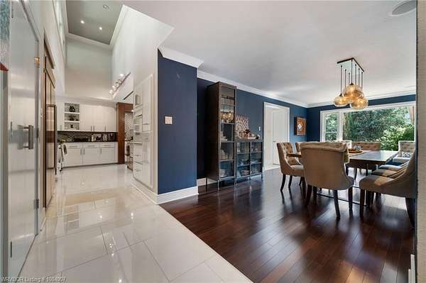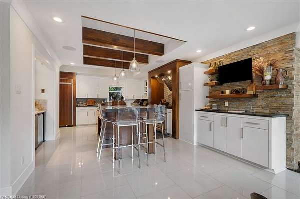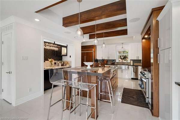 The chef's kitchen features a large island with built-ins, premium appliances, and abundant storage. Three spacious living areas offer flexibility for gatherings or quiet relaxation, while the sunroom fills the home with natural light and serene views.