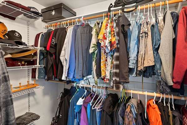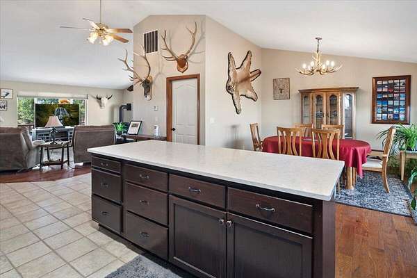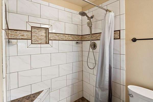 - Breakfast Bar, Ceiling Fan(s), Double Vanity, Granite Counters, Kitchen Island, Open Floorplan, Primary Downstairs, Shower/Tub Combo, Smart Thermostat, Solid Surface Counters, Stone Counters, Vaulted Ceiling(s), Walk-In Closet(s)