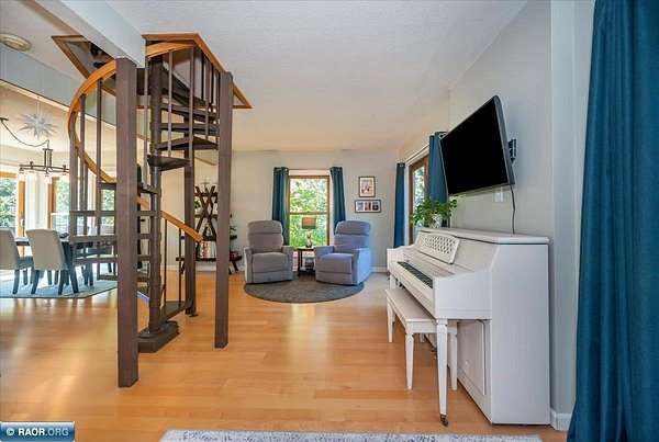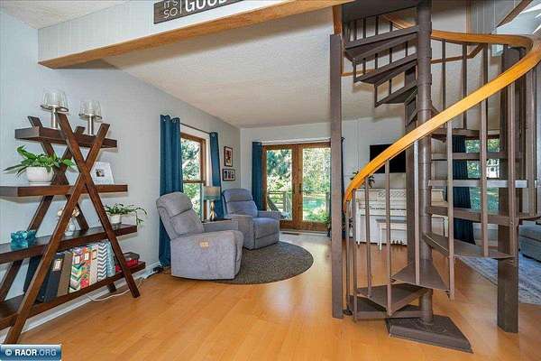 Welcome to this enchanting one of a kind beauty. This architecturally unique home offers abundant storage, thoughtful design, and flexible living space. A striking spiral staircase connects the main and upper levels while serving as a beautiful focal point. The bright solarium entry flows into the family room, creating a multifunctional space filled with natural light. At the heart of the home, the updated kitchen blends style and convenience. Custom cabinetry, pull out drawers, and built-ins maximize storage and organization throughout. Two bathrooms and adaptable rooms provide comfort and practicality for a variety of needs. Large windows frame views of the landscaped yard. Outdoor living is enhanced by multiple decks, a private backyard with lush perennials, and inviting spaces to gather. A detached shed offers extra storage or hobby use, while a rear carport off the second driveway provides additional covered parking or flexible storage.