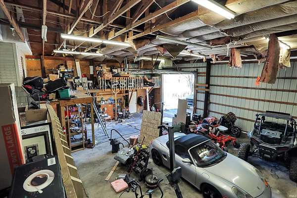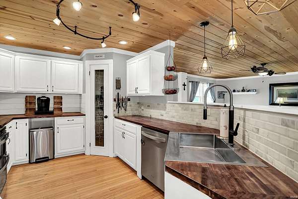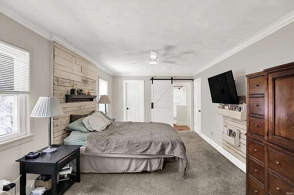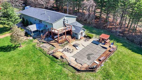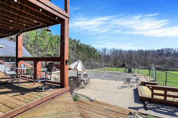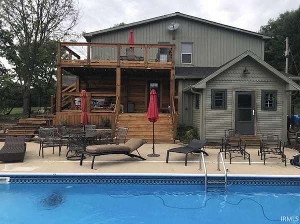 Welcome to this one-of-a-kind 3-bedroom, 2-bathroom retreat nestled on 5.8 private acres in the sought-after Center Grove school district, where nearly every inch has been thoughtfully updated and customized since purchase. The upper level impresses with soaring tongue-and-groove wood ceilings, rich hardwood floors, and an expansive open living and dining area flowing into a beautifully updated kitchen with stainless appliances, a farmhouse sink, shiplap accents, and a dedicated pantry. The oversized primary suite features a newly renovated full bath, two large walk-in closets, and a stunning reclaimed wood accent wall, while a second spacious bedroom with its own large walk-in closet, and a shiplap-accented office complete the upper floor. The main level delivers incredible entertaining space anchored by a wood-burning masonry fireplace with a new custom mantle, a custom wet bar with live-edge countertop and stone backsplash, 2nd full bathroom, and a third bedroom — all opening to recently reconstructed multi-level decks, including a covered pergola bar area with string lights, overlooking the fenced in-ground pool with a new liner (2yrs) and brand new equipment (1yr). Connected to city water and equipped with a new water softener, newer A/C (3 yrs), tankless water heater, and newer roof (~3 yrs), this property is priced to move. Schedule your showing today!
