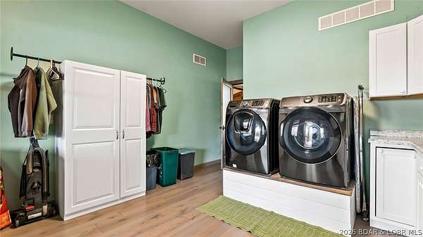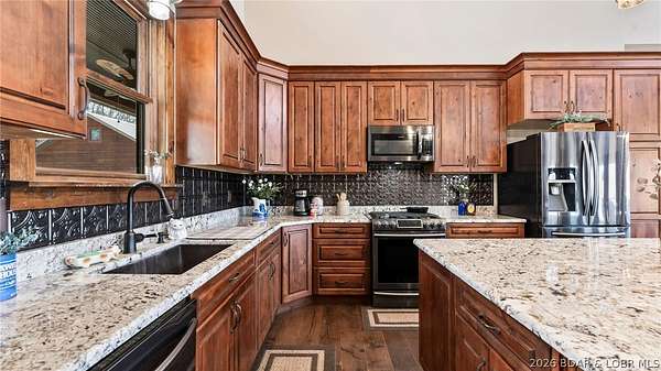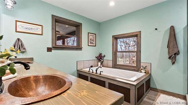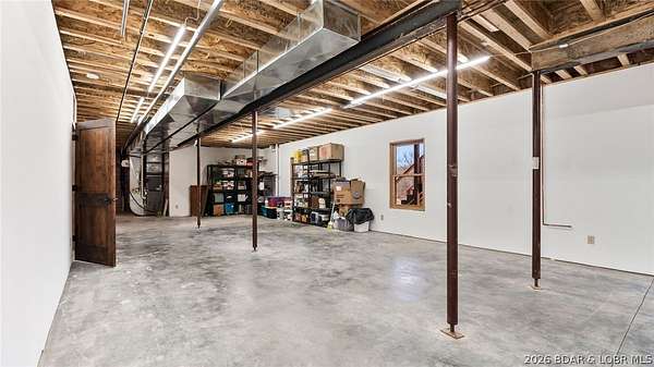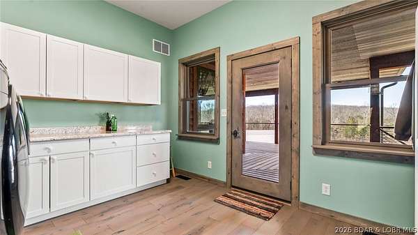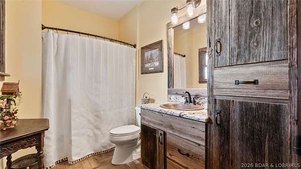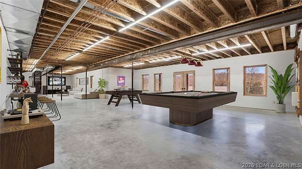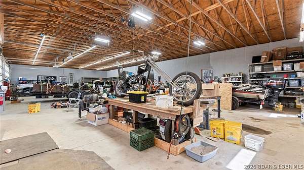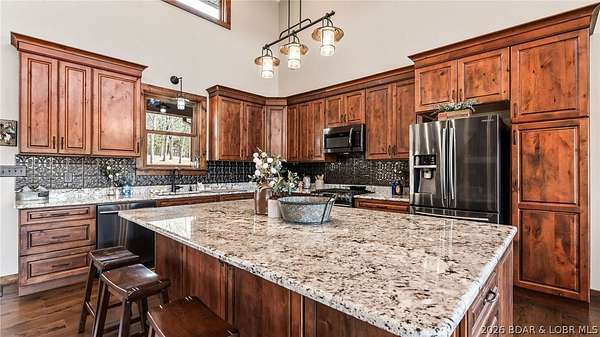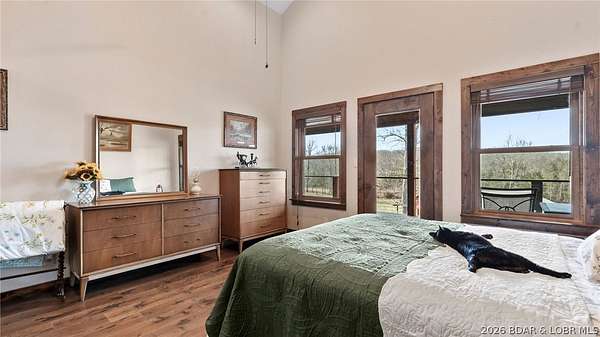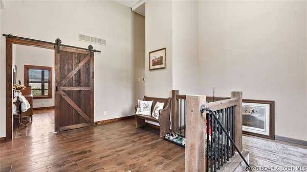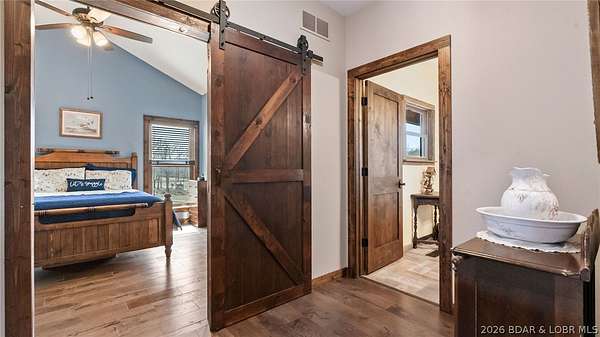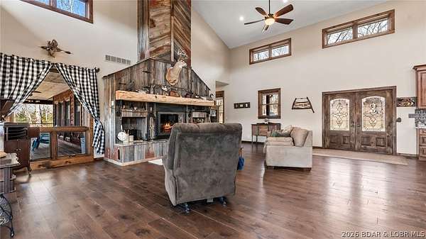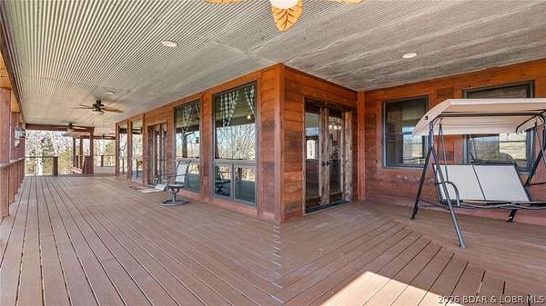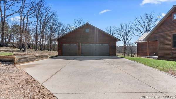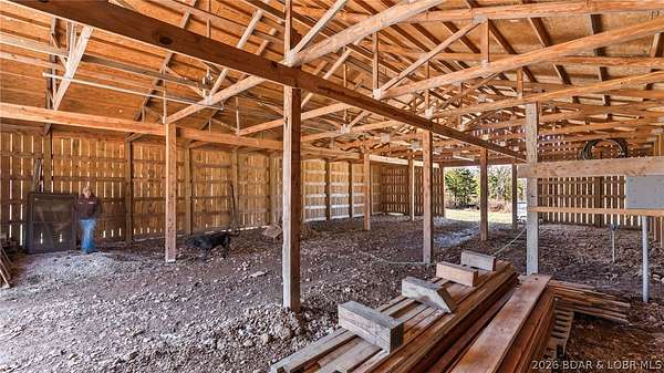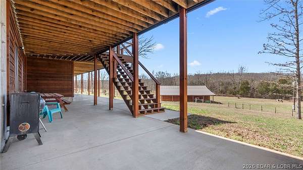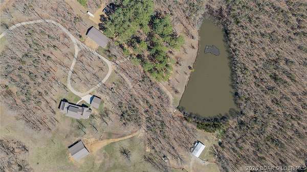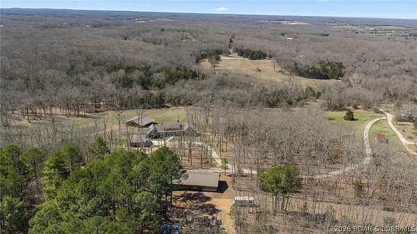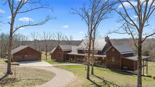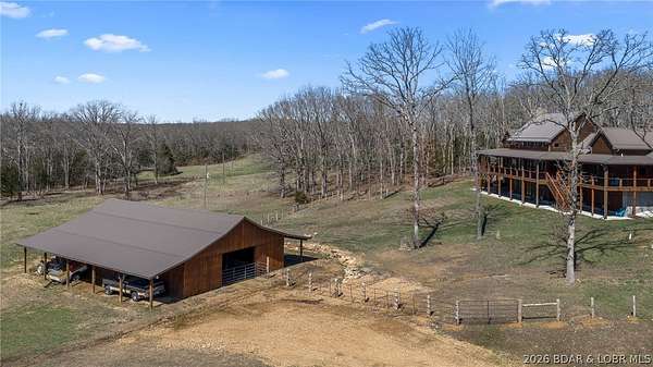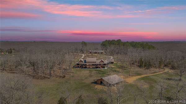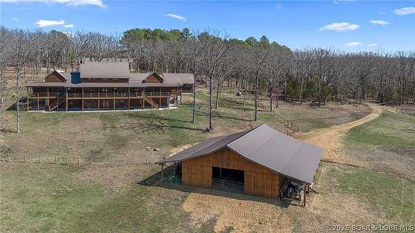 This exceptional 105+/- acre Ozark ranch offers a rare blend of scenic beauty, quality improvements, and a lodge-style home reminiscent of Yellowstone or Big Cedar. The property features fenced pastures bordered by timber, a picturesque 1+/- acre stocked pond, and a wet-weather creek winding through the valley floor, creating a setting that is both functional and beautiful. Ideal for an equestrian estate, recreational retreat, or private family getaway. Improvements include automatic drinkers, a 30x56 hay barn with water and solar lighting, a 60x60 horse barn with water and 100-amp service, a 28x36 detached garage with 100-amp electric, and a 40x80 insulated shop with 200-amp service-providing excellent infrastructure for livestock, equipment, and hobbies. The 3 bedroom, 3.5 bath lodge-style home features vaulted ceilings, rich wood finishes, knotty alder cabinetry, granite countertops, and a marble fireplace hearth anchoring the main living space. Each bedroom has direct access to the covered wraparound deck overlooking the valley below, offering peaceful views in every season. Private and serene, yet conveniently located with quick access to Interstate 44.