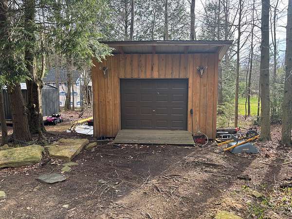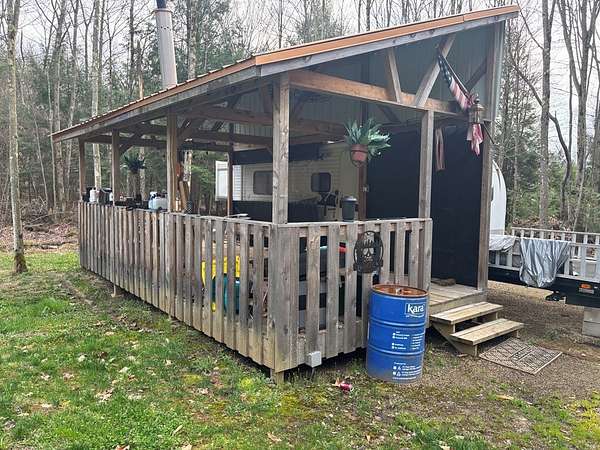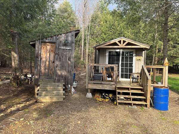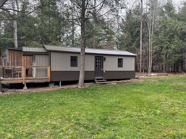 Tucked on 7.3 wooded acres, this private getaway is ideal for hunters and ATV enthusiasts. Set approx. 200' off the road, the property borders Rails-to-Trails and is minutes from the Allegheny National Forest, Marienville ATV trails, and horse trails—ride right from your land. Features a 12'x34' one-room cabin with steel exterior and 8'x12' deck, plus kitchenette with sink and fridge. Separate 6'x8' bathhouse with sink, toilet, and shower. Camper-ready with full hookups and covered deck—perfect for camp guests. Includes two sheds (8'x10' metal, 12'x16' wood with electric) for gear and ATVs. Just 1 mile to town with a bar/restaurant nearby. Rare mix of seclusion, trail access, and public utilities—perfect basecamp for year-round outdoor adventure.