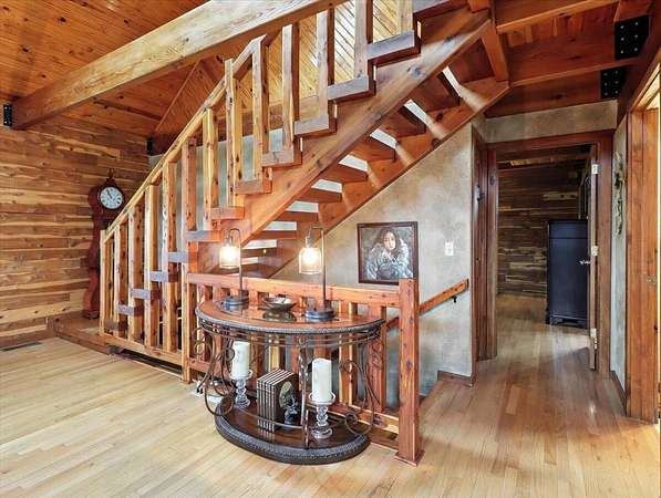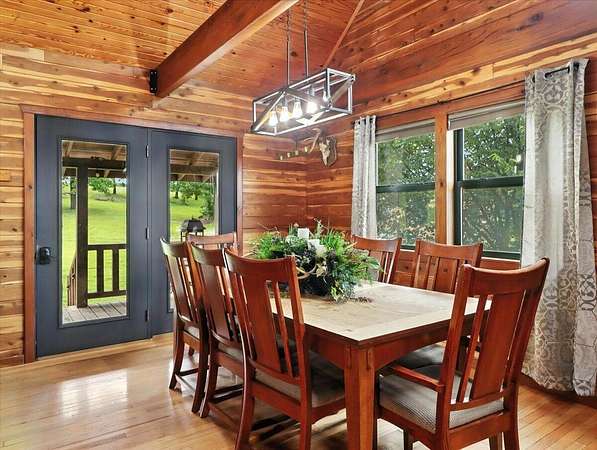 Beautiful custom log home on 4.34 acres, ideally situated overlooking a private lake stocked with Blue Gill,Catfish,Crappie,and Bass, just minutes from West Plains. The main level features a spacious living room with high ceilings a fireplace, country-style kitchen, dining area, utility room, full bath, and a large master suite designed for comfort and practicality. Interior highlights include open beam ceilings, hardwood floors, ceramic tile, granite countertops, gas fireplace, storage throughout, a water softener, attic fan, skylights, and remote-controlled ceiling fans.This home blends thoughtful design with energy-conscious features in a scenic setting.Upstairs includes two additional bedrooms, a full bath, and an open office area, offering flexibility for both family living and remote work. The walkout basement adds even more living space, with a second bath, a large pantry, and direct access to an oversized two-car garage.Enjoy peaceful views of the lake from both the front and back covered porches perfect for relaxing or entertaining. A professionally installed 19-panel solar system (2016) helps reduce electricity costs and includes a whole-house energy audit for added efficiency and it is fully paid for and conveys with the home!The fully insulated 30' x 50' shop is climate controlled and includes a utility room, RV hookup, and waste discharge .Another great feature are the 12 ft garage doors on each side of the Workshop!