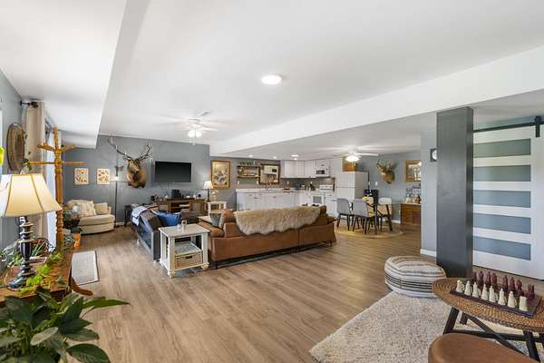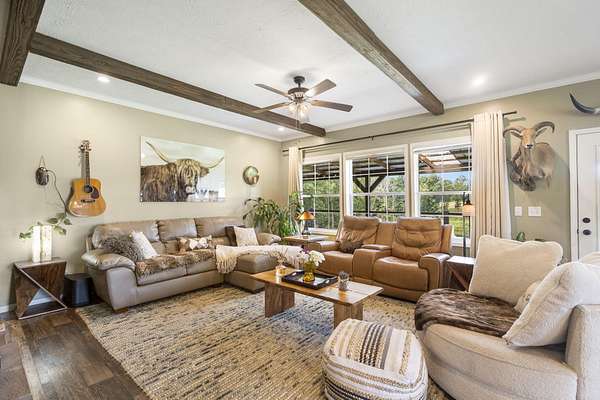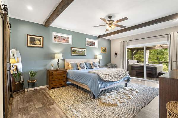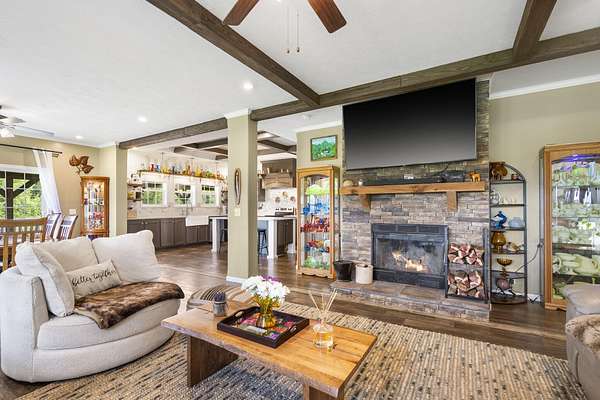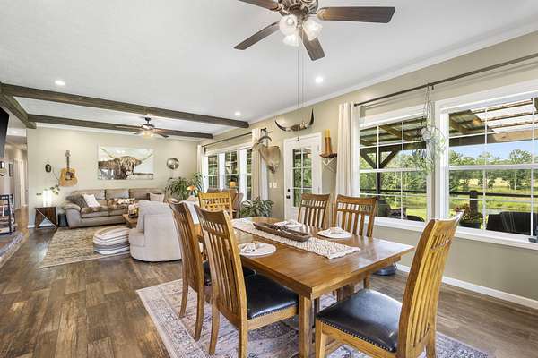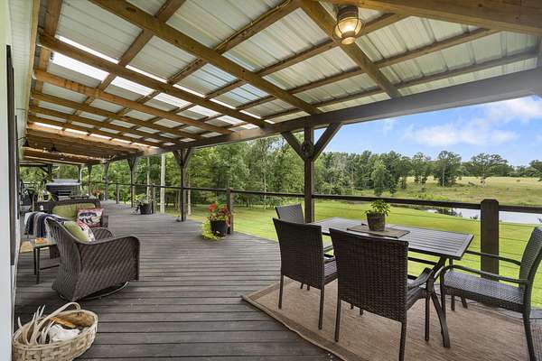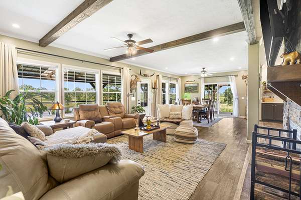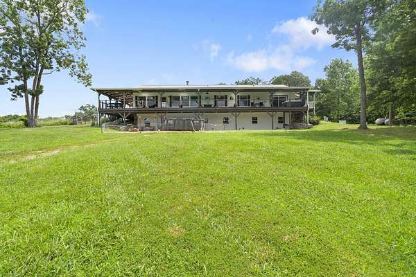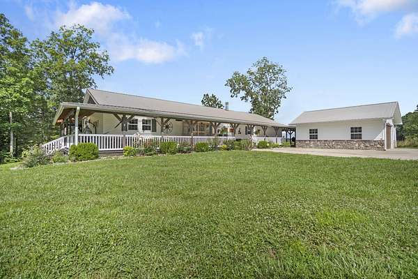 This home is tucked away off Highway 13, a short drive to Springfield and just minutes from Bolivar & CMH hospital. With a gated, private entry this Magnificent 77 acre cross-fenced property offers the ultimate privacy, versatility, and tranquility. Gentle Rolling Hills, A Perfect Blend of Pasture and Forest. Attracting exceptional numbers of deer, turkey and other wildlife. This is truly a one of a kind property. Newly built in 2020 offering over 4,100+ sq. ft 7 BD, 4 BTH is an Outdoorsman's dream designed with intention and heart. The main home, custom built with two full kitchens, two laundry rooms, a walkout basement and a wrap-around fully covered deck, making outdoor entertaining easy. The main level made for connection, with a large great room featuring wood beamed ceilings, a stunning brick wood burning fireplace, large windows, and a spacious dining area for big family dinners. The kitchen features an island, quartz countertops, a large sink, ample cabinet space and a walk-in pantry. The master suite is your own private retreat with a huge walk-in shower, jetted tub and dual vanities. While the charming Barn-style door adds a rustic touch. New large glass sliding doors make it easy to access the hot tub and wrap-around deck, offering convenience and abundant natural light. The walkout basement, features a full kitchen, gym and sauna room, dual vanity bathroom, and pantry or extra storage space. While this property is equipped with a whole home Generac generator for peace of mind. Outside,Three Serene ponds one stocked add to the charm while a 30x50 heated and cooled shop provides ample equipment storage and workspace for hobbies or business. A second home, the cottage house, with its own well, electric and Sewer this home offers rental income or even more space for guests or in-laws. Recent updates include a brand new roof, new LVP flooring on the main level and extensive landscaping.