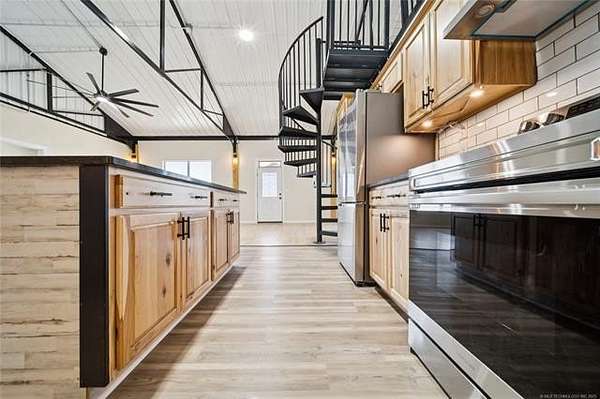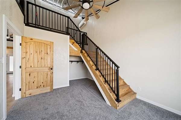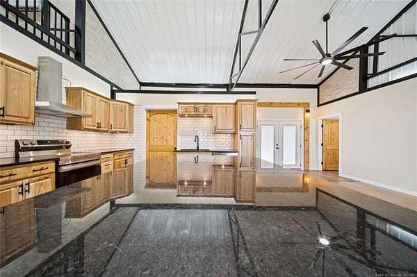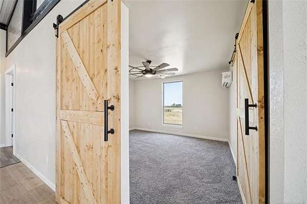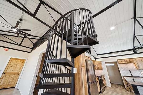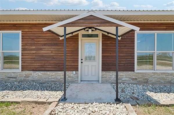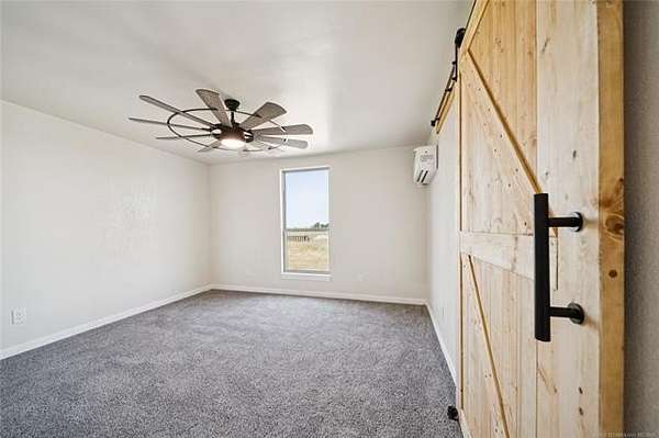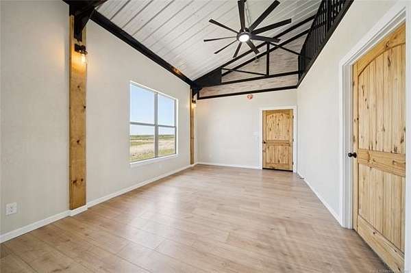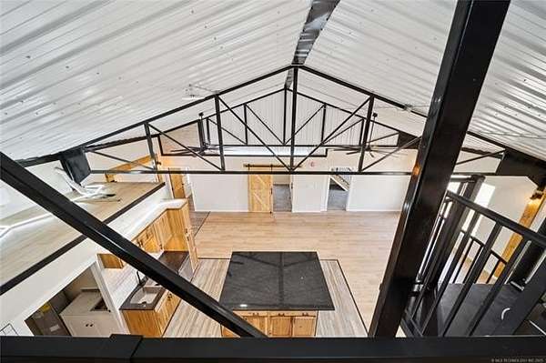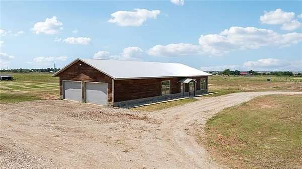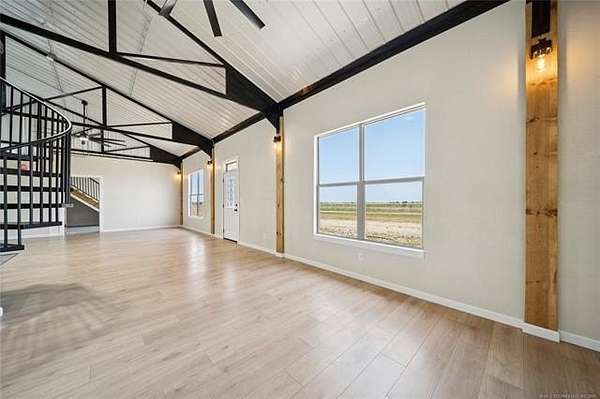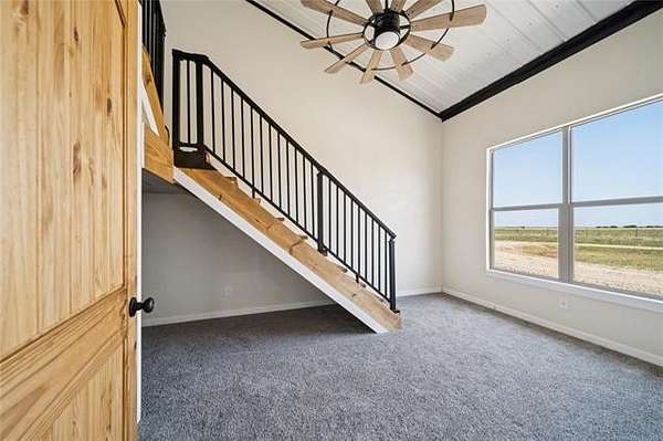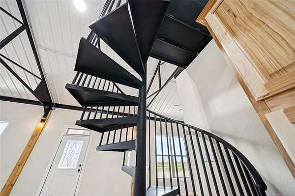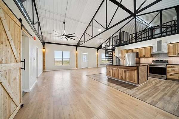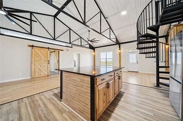 New Construction Barndominium on approx. 3.77 Acres m/l - Move-In Ready! Brand new 2,157 sq ft (not reporting, new construction) Barndominium situated on approx. 3.77 m/l unrestricted acres with stunning views of open fields and frequent wildlife sightings. This 3-bedroom, 2.5-bath home features an open-concept layout with vaulted ceilings, oversized fans, and energy-efficient split units for year-round comfort. The kitchen includes an extra-large island with storage, granite countertops, stainless steel appliances, a vent hood, and LED lighting throughout. A spiral staircase adds a custom touch and leads to two versatile loft spaces perfect for an office, game room, guest area, or hobby room. Primary suite includes a private bath and an oversized closet with built-in dresser. Flooring is a combination of laminate and carpet. Exterior features include log siding, stone veneer, a metal roof, and a covered patio with easy potential for an outdoor kitchen. 4 car garage, aerobic septic system, and rural water. No restrictions! Bring your hobby farm dreams to life! Additional land available.