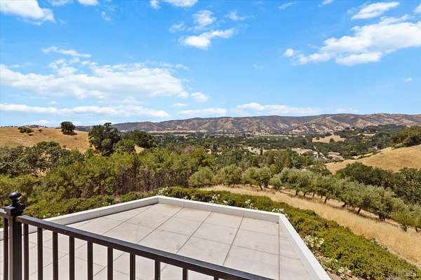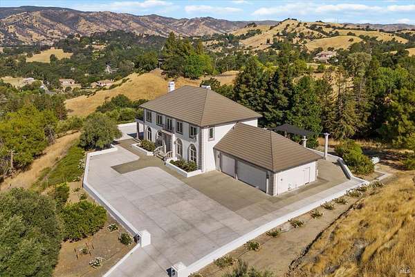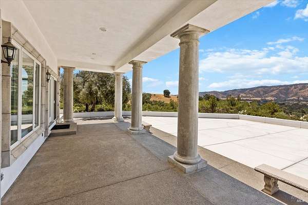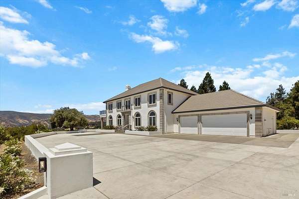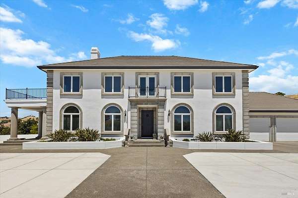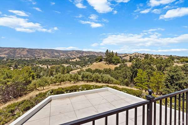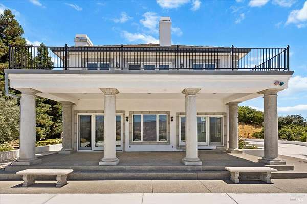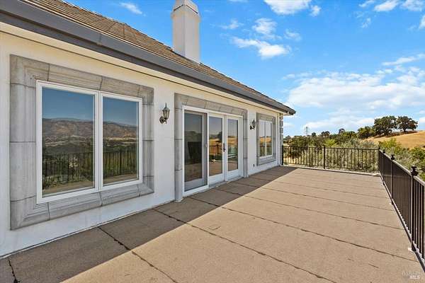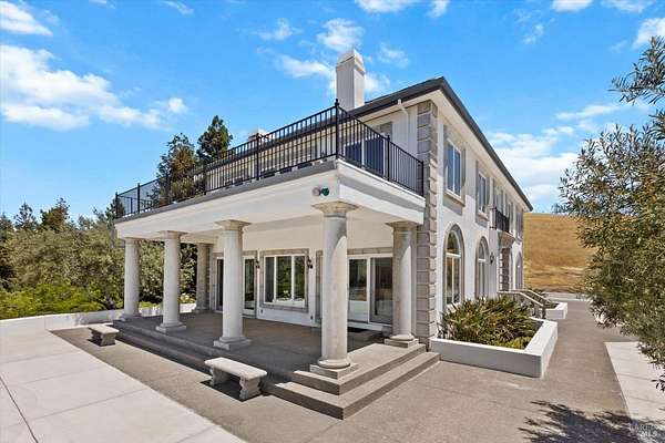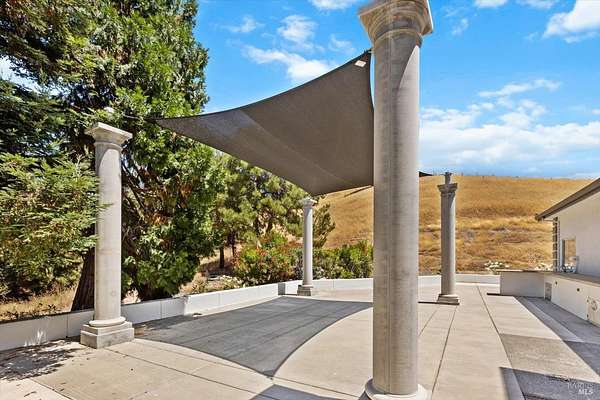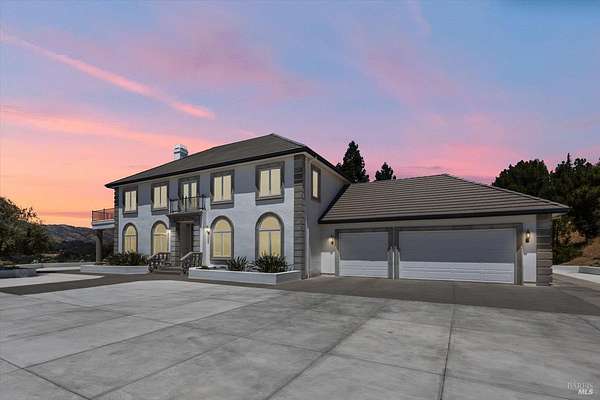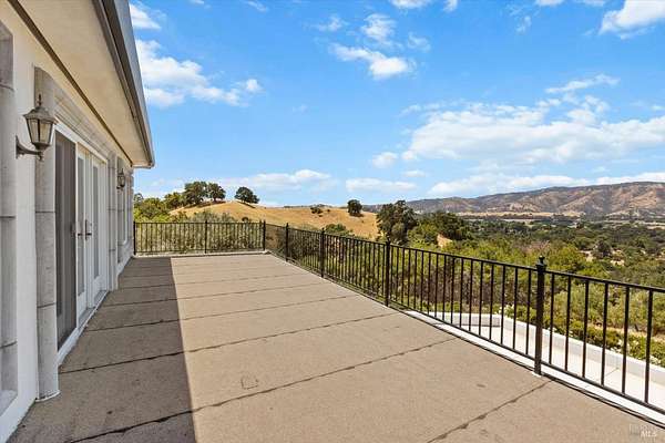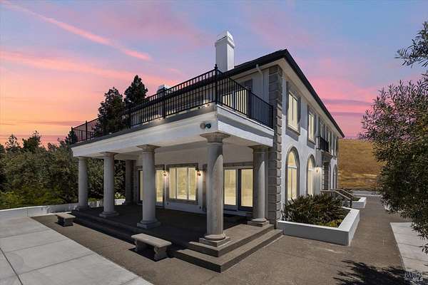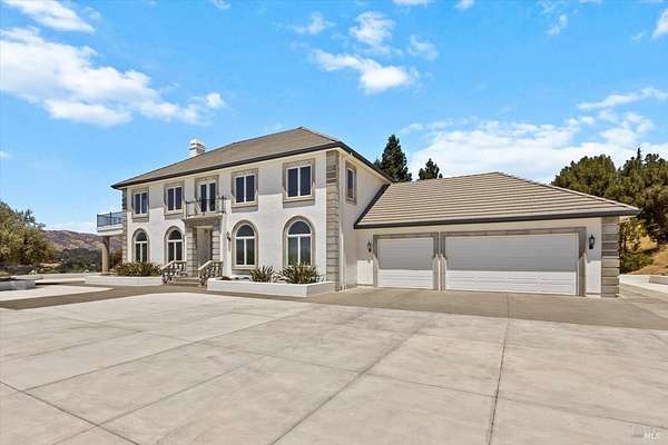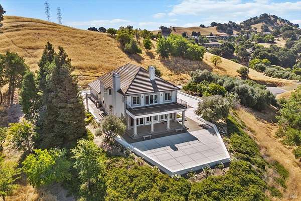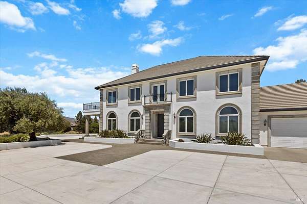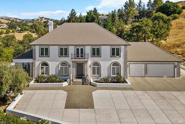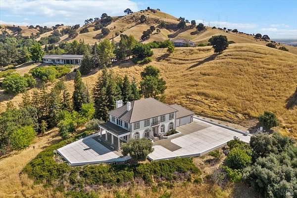 This custom estate, perched on a scenic hillside above historic Vaca Valley and just minutes from downtown Vacaville, offers panoramic views and privacy on over 5 acres. The remodeled home, with over $175,000 in custom upgrades, features 7 bedrooms, 6.5 bathrooms, including 3 master suites. The property boasts over $200,000 in custom concrete work, an extended driveway, and a spacious patio perfect for entertaining while enjoying the incredible vistas. Outdoor living includes a loggia with cast stone columns, an expansive covered piazza with a sink and stone counters, an outdoor kitchen, low-maintenance landscaping, manicured trees, an automatic sprinkler system, and outdoor lighting. A 3-car garage with built-in cabinetry completes the exterior. Inside, the updated gourmet kitchen has white cabinetry, granite countertops, a large island with a sink, gas range, stainless steel appliances, and a cozy breakfast area. The home features dual-pane windows, French doors, crown molding, recessed lighting, and remodeled bathrooms. The upstairs master suite has a fireplace, private balcony, and ensuite bath with a dual-sink vanity and glass-enclosed shower, offering modern luxury and comfort throughout. This high-end estate offers luxury, and stunning views in a private hillside setting.