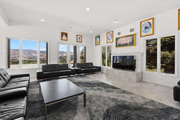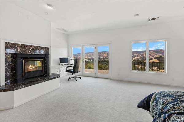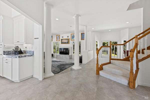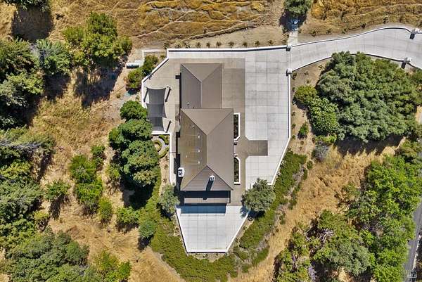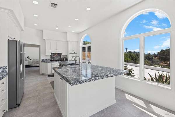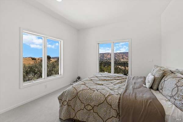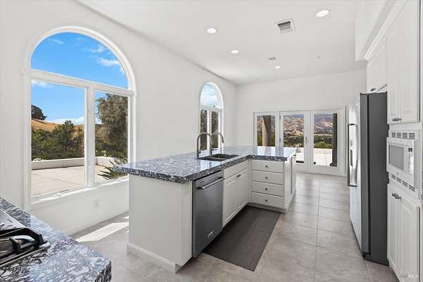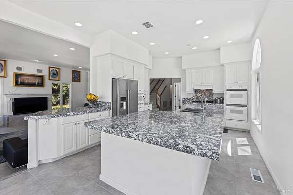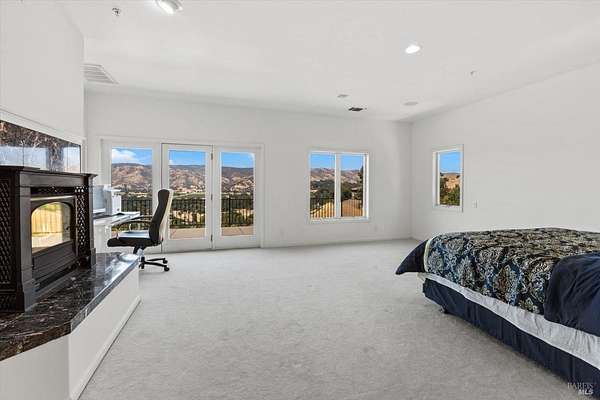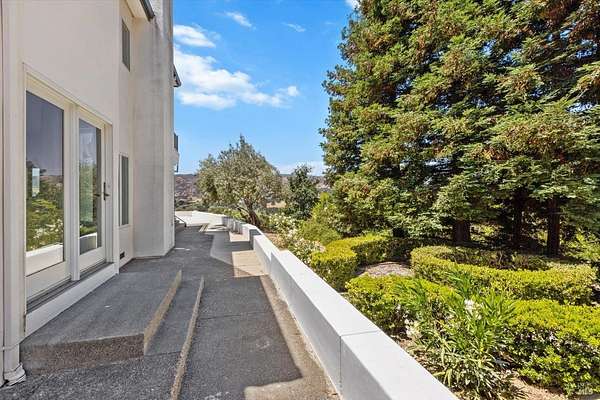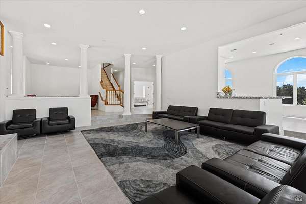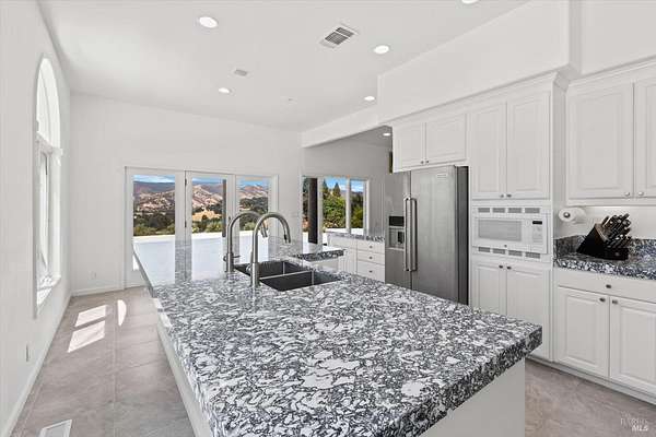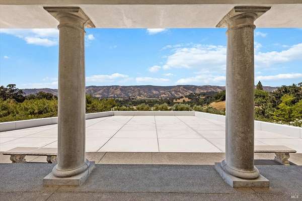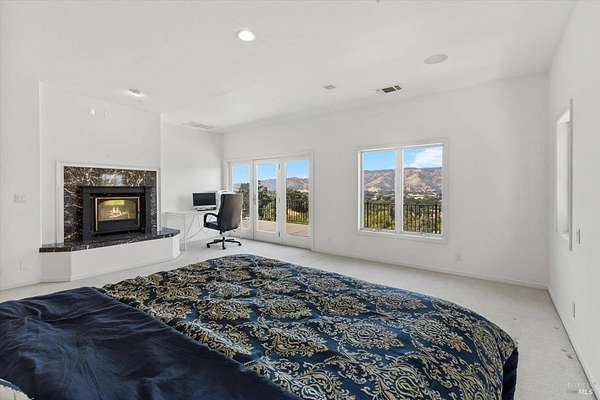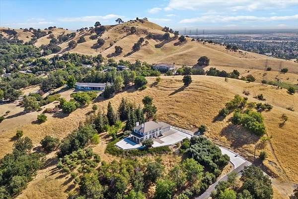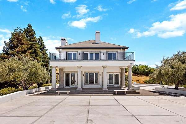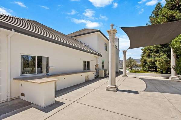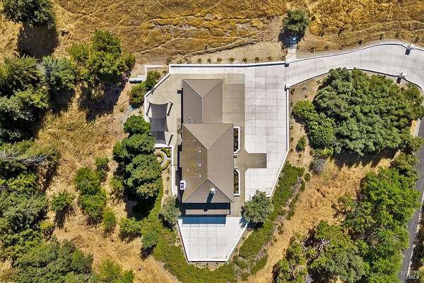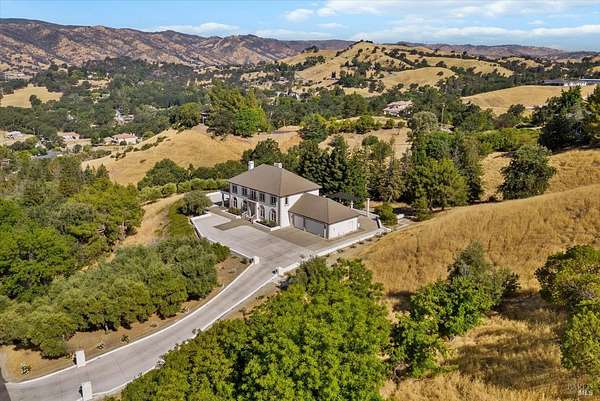 This custom estate, perched on a scenic hillside above historic Vaca Valley and just minutes from downtown Vacaville, offers panoramic views and privacy on over 5 acres. The remodeled home, with over $175,000 in custom upgrades, features 7 bedrooms, 6.5 bathrooms, including 3 master suites. The property boasts over $200,000 in custom concrete work, an extended driveway, and a spacious patio perfect for entertaining while enjoying the incredible vistas. Outdoor living includes a loggia with cast stone columns, an expansive covered piazza with a sink and stone counters, an outdoor kitchen, low-maintenance landscaping, manicured trees, an automatic sprinkler system, and outdoor lighting. A 3-car garage with built-in cabinetry completes the exterior. Inside, the updated gourmet kitchen has white cabinetry, granite countertops, a large island with a sink, gas range, stainless steel appliances, and a cozy breakfast area. The home features dual-pane windows, French doors, crown molding, recessed lighting, and remodeled bathrooms. The upstairs master suite has a fireplace, private balcony, and ensuite bath with a dual-sink vanity and glass-enclosed shower, offering modern luxury and comfort throughout. This high-end estate offers luxury, and stunning views in a private hillside setting.