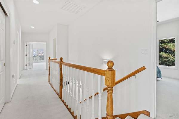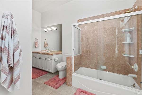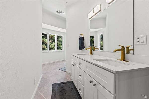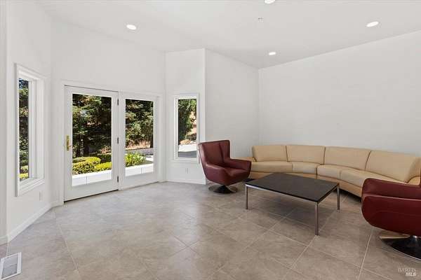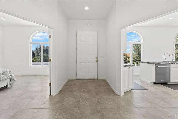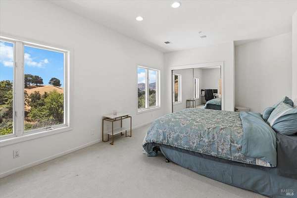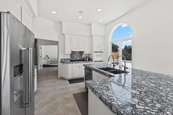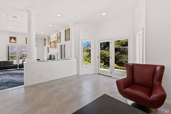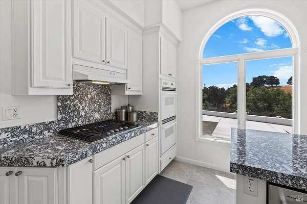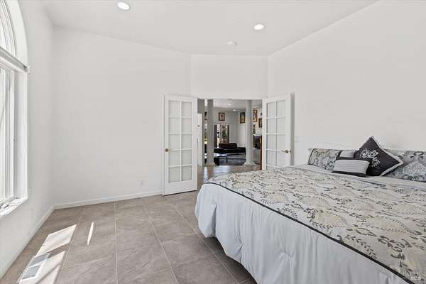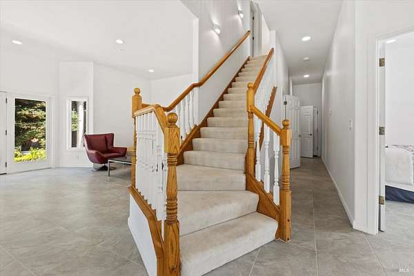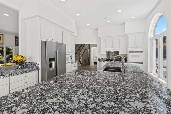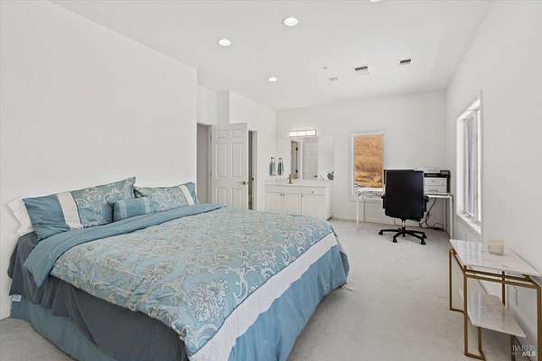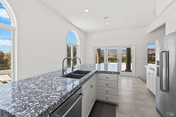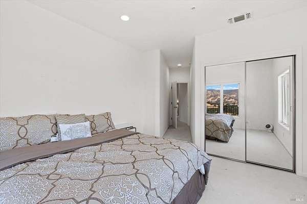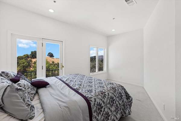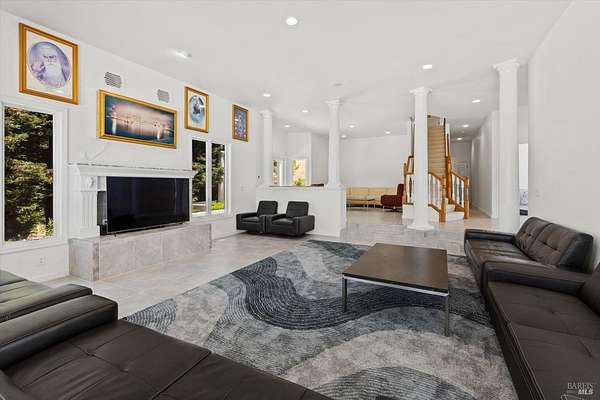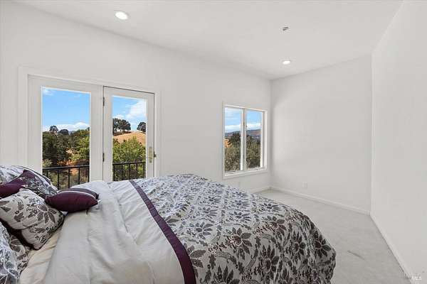 This custom estate, perched on a scenic hillside above historic Vaca Valley and just minutes from downtown Vacaville, offers panoramic views and privacy on over 5 acres. The remodeled home, with over $175,000 in custom upgrades, features 7 bedrooms, 6.5 bathrooms, including 3 master suites. The property boasts over $200,000 in custom concrete work, an extended driveway, and a spacious patio perfect for entertaining while enjoying the incredible vistas. Outdoor living includes a loggia with cast stone columns, an expansive covered piazza with a sink and stone counters, an outdoor kitchen, low-maintenance landscaping, manicured trees, an automatic sprinkler system, and outdoor lighting. A 3-car garage with built-in cabinetry completes the exterior. Inside, the updated gourmet kitchen has white cabinetry, granite countertops, a large island with a sink, gas range, stainless steel appliances, and a cozy breakfast area. The home features dual-pane windows, French doors, crown molding, recessed lighting, and remodeled bathrooms. The upstairs master suite has a fireplace, private balcony, and ensuite bath with a dual-sink vanity and glass-enclosed shower, offering modern luxury and comfort throughout. This high-end estate offers luxury, and stunning views in a private hillside setting.