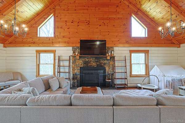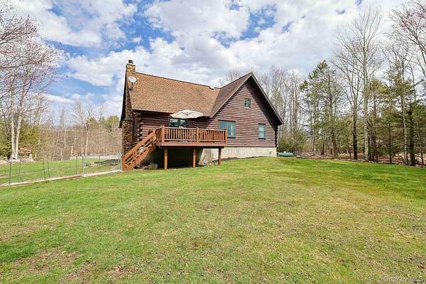 Privately set Log within the Smallwood community on 3.45 acres of land. Vaulted ceilings upon entrance, with a large stone fireplace as the focal point of the living room, country white kitchen accents nicely off wood floors and ceilings. Main level features two bedrooms and full bathrooms, large main suite upstairs with private loft area currently used as gym and office space. Bedroom features Juliet balcony overlooking front of property along with large walk in closet and full bathroom. Fully finished walkout basement with separate ground floor entrance. Full bathrooms and sleeping area in basement along with living room area, could double as in law suite if needed or additional living space. House has 2 car garage along with whole house back up propane generator. Private back yard with separate fenced area for animals along with fire pit seating area in back. Smallwood community offers lake access with on duty lifeguard for swimming and beach area, pool, sports courts, general store and its own post office. Close to bethel woods for concerts along with a short distance to the delaware river for tubing activities, local golf courses close by along with other leisure activities.
