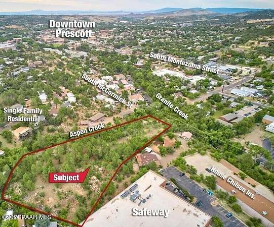 Est $4,849/moTruly a rare property in the heart of Prescott. With BG zoning the possibilities are varied with commercial and residential uses. There are some granite boulders, some level and some gentle slopes, Ponderosa Pines and native vegetaion, with Aspen Creek barely skirting the northern edge. Access from South McCormick is limited at this time due to Aspen Creek Drainage needing to be crossed.