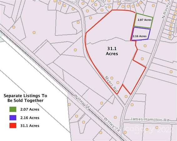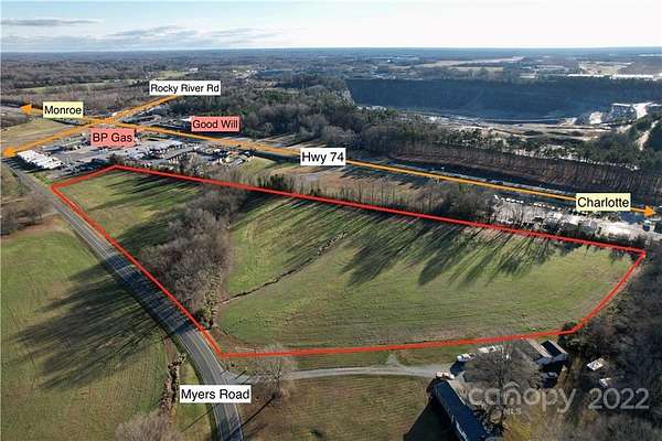 City water on site and sewer can be requested from the City of Monroe. Minutes to the Monroe Bypass and 800 feet away to Highway 74. Current zoning has 30+/- acres zoned CC-MX1. Numerous possibilities exist. Parcel numbers include #09336018, #09336018C, 09336018G