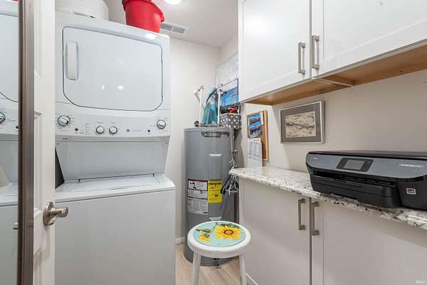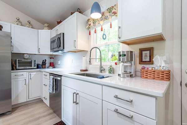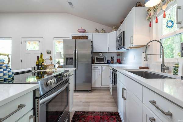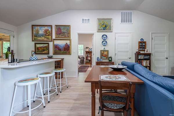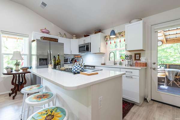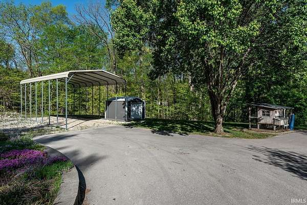 Tucked away among towering trees, situated on over 2 acres, this charming cottage offers the perfect blend of nature and tranquility. From the moment you arrive, you’ll feel a sense of privacy and peacefulness as the home welcomes you with its warm character and storybook setting. Inside, you’ll find a cozy, light-filled great room with cathedral ceiling, recessed lighting and wood laminate flooring. A delightful kitchen overlooking the great room has white cabinets, quartz countertops, stainless steel appliances and a breakfast bar. Off the kitchen is the primary suite with adjoining laundry room/office and bathroom, with his & hers mirrors, a quartz top vanity and shower with corner seat. The 2nd bedroom is precious! Small, but inviting. There is a ½ bath off the great room. A true sense of home, ideal for relaxing weekends, rentals, or year-round living. Every inch of space has been meticulously designed to enhance comfort and relaxation. Step outside to enjoy your own private retreat—whether it’s sipping morning coffee on the screened porch, entertaining under the canopy of trees, or unwinding by a firepit beneath the stars. This unique property is filled with professionally designed retaining walls, gardens, and features two outdoor decks. Perfect for car lover’s, RVs, or boats the 35’ x 20’ steel carport is ideally located next to the custom built 12’ x 10’ garden shed. Convenient to all Bloomington has to offer. Wonderful schools nearby. Despite its tranquil setting you’re only 8-10 minutes to the IU Football stadium and basketball arena, Lake Griffy, IU campus and downtown. Looking for a large lake experience, Bloomington’s 1st established boating lake, Lake Lemon, is only 20 minutes away. Consider building your dream home on the front section of the acreage while living in the cottage when under construction. Where, charisma and possibilities meet, properties with this blend of privacy and proximity are few and far between.