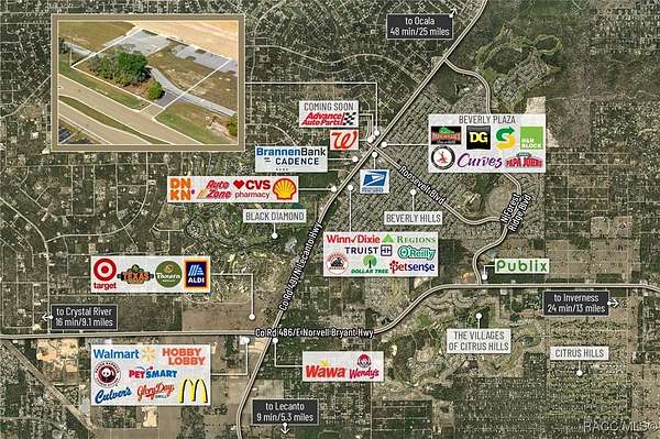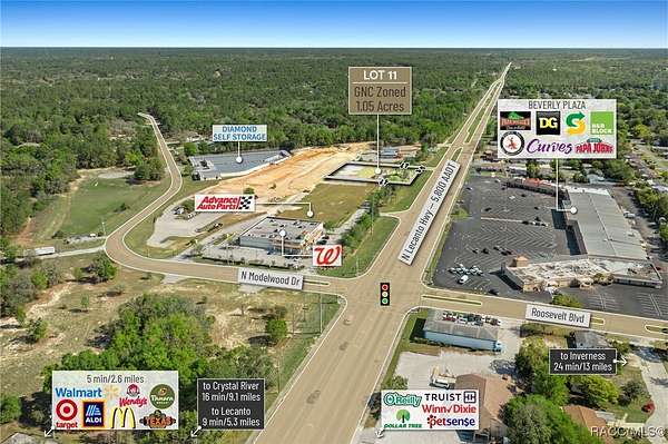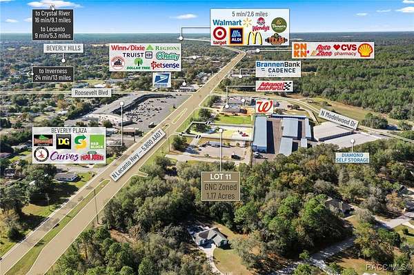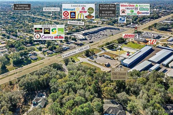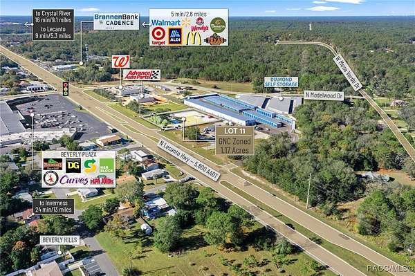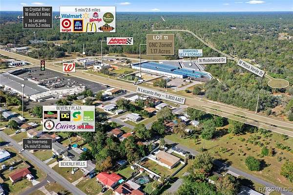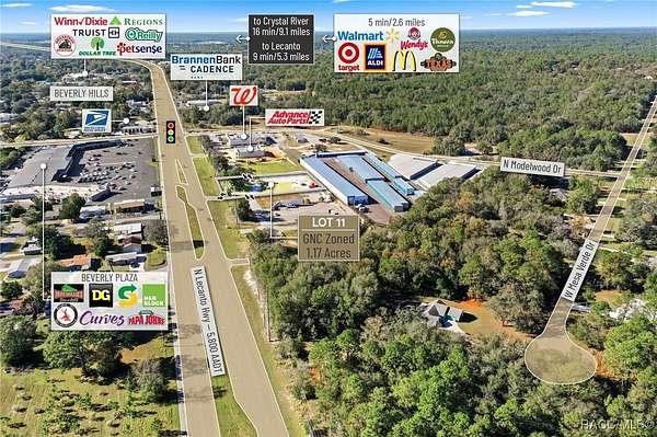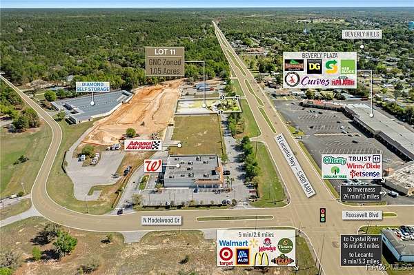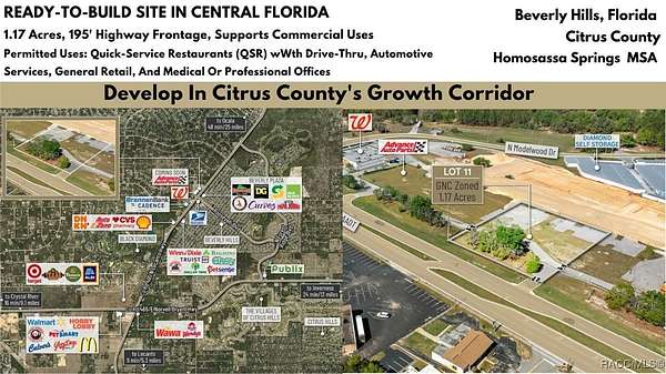 Located in the heart of Citrus County's growth corridor, Lot 11 is an outparcel within the newly developed Golden Gate in Beverly Hills, Florida. This 1.17-acre site is zoned for a variety of commercial uses, including quick-service restaurants (QSR) with drive-thru, automotive services, general retail, and medical or professional offices. It is part of a thriving development alongside established businesses such as Walgreens, Advance Auto Parts, and the new Pizza Hut with drive-thru. The property offers excellent visibility with over 195 feet of highway frontage along Hwy 491 and convenient access via the signalized intersection at N Modelwood Drive and Hwy 491. Multiple points of entry, including three from CR 491 and two from N Modelwood Drive, provide seamless connectivity to adjacent parcels through a cross-access service road, with both front and rear access to the parcel. Just 2.8 miles north of the Central Ridge regional shopping district, this location is near major retailers like Walmart, Target, Aldi, Hobby Lobby, Texas Roadhouse, Panera Bread, 7-Eleven, and other national and regional brands. The site is cleared and ready for development, with access to offsite retention for maximum lot utilization, and city water and sewer lines already in place. Additionally, shared signage will enhance the visibility of businesses located on the property. Disclaimer: All information provided herein is for marketing purposes only and is not guaranteed for accuracy. Prospective buyers or tenants are encouraged to conduct their own independent due diligence. The seller, broker, and associated parties make no representations or warranties, expressed or implied, as to the accuracy or completeness of this information. All dimensions, zoning details, financial data, and other property-related facts should be independently verified. Please consult with appropriate licensed professionals before making any investment or purchasing decisions.