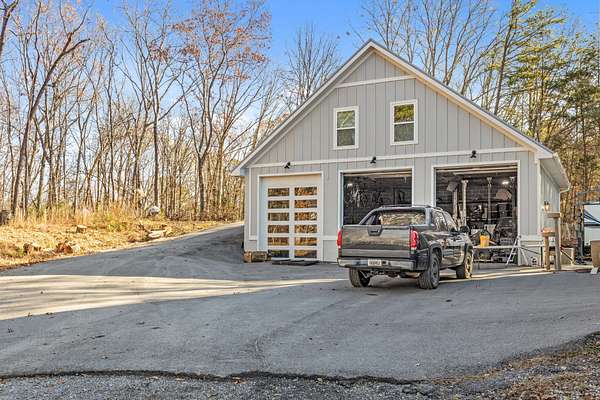 A standout feature of the property is the three-bay, shop-style garage, each bay with 10' doors and built two cars deep, providing exceptional room for vehicles, equipment, or workshop needs. A half bath adds convenience for projects and outdoor work.