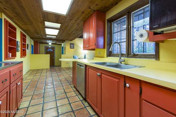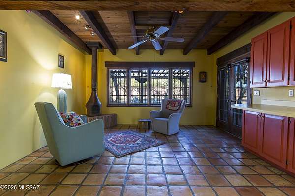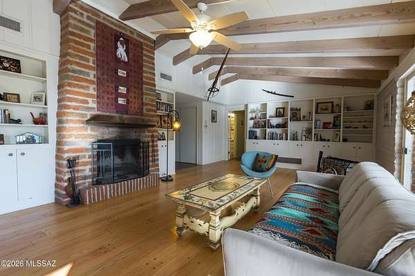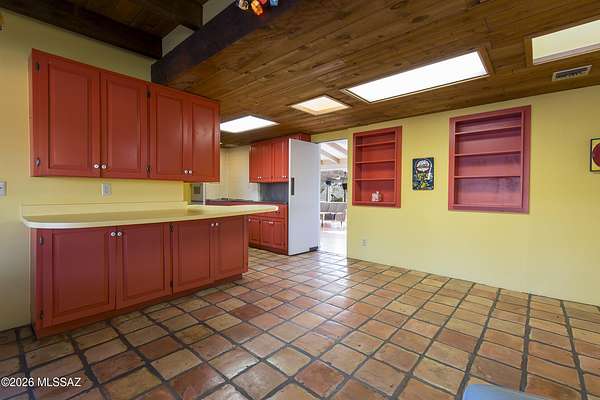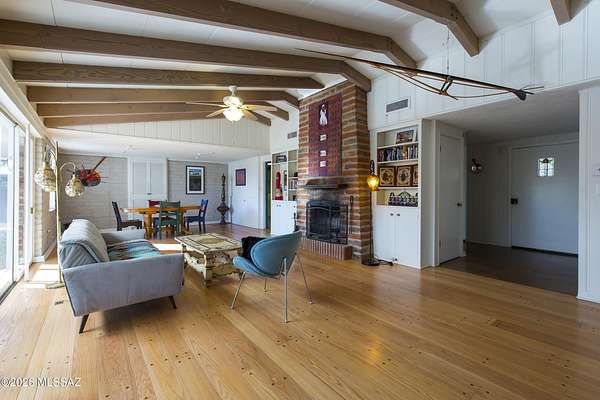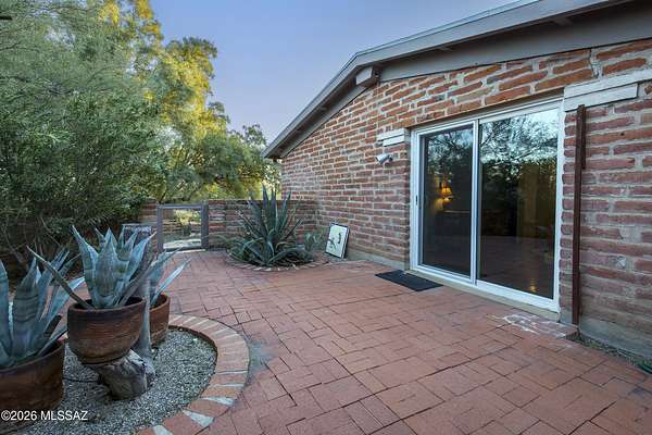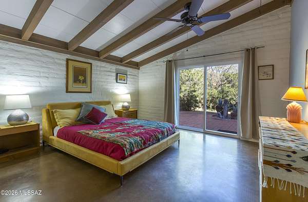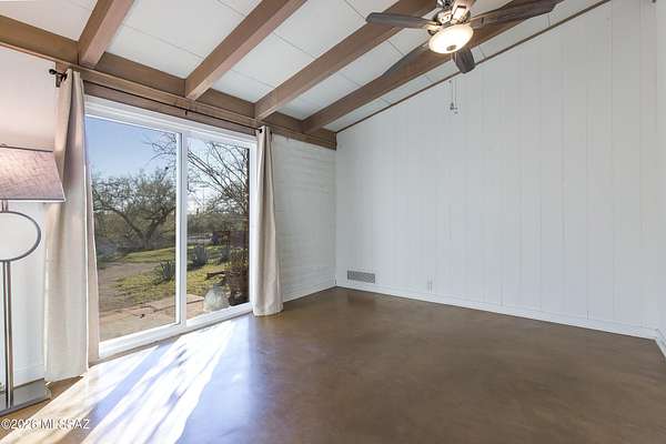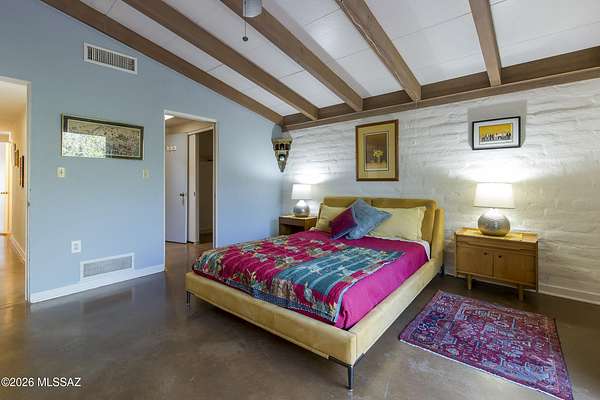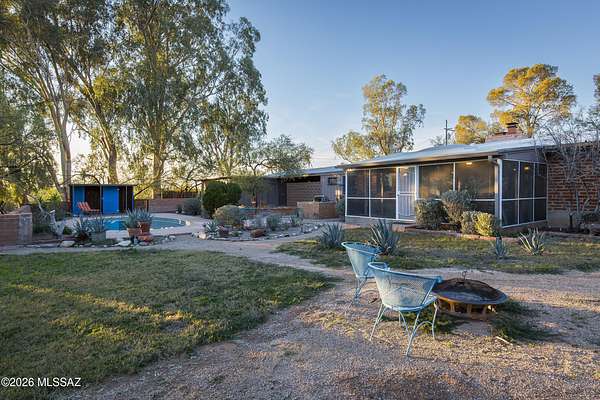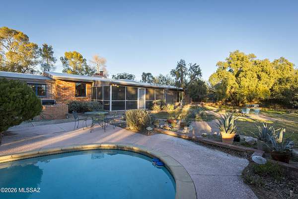 If you love a vintage vibe, and you're looking for your forever home, this is it! Situated on 3 plus acres of desert bliss, and built by Tucson-Famous Architect William Hazard, this mid-century home is a stone's throw from the Rillito, with a very productive private well. Many intact original features. Initially built as a 3 bed 2 bath, early on it was expanded off the galley kitchen to include a family/breakfast room, guest ensuite, and sizeable laundry room. Original stained concrete. Original wood floors. Vintage saltillo. Vaulted ceilings with exposed beams. Large great room with abundant light is adjacent to generous screened-in patio. Primary ensuite has it's own private patio. Two other bedrooms are light filled with sliding glass doors that open onto the back yard. The pool is located in a low-fenced area and landscaped with some natives and some exotics. Beyond the wall is pristine, a true Sonoran desert wildlife sanctuary. From the fenced yard, there is a trail to the guest house, which is also accessible by a long, long driveway. The 1990-built burnt adobe 1 bed/1 bath is 700+ sqft and has a carport, screened patio and fenced yard. When you visit the guest house, be sure to check out the well. There are flags behind the guest house to guide you there. There is plenty of room at West portion of the property to possibly install horse facilities. This is horse property by zoning. A short walk/ride to the Rillito and it's multi-use paths. 500+ square feet of storage off the main house carport can be used as-is or potentially developed for additional living space. This property is a must-see. Call for an appointment today!