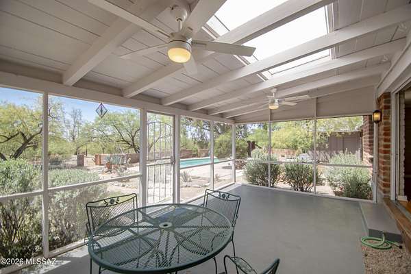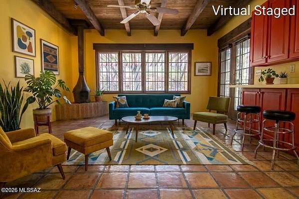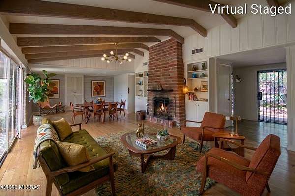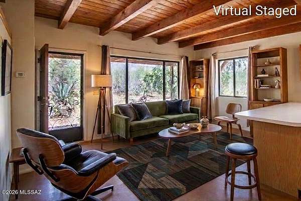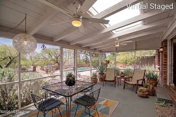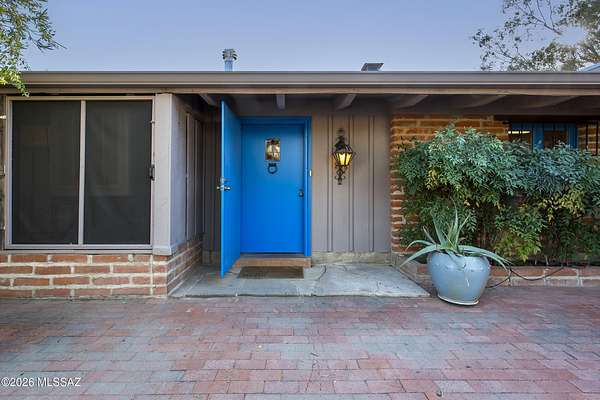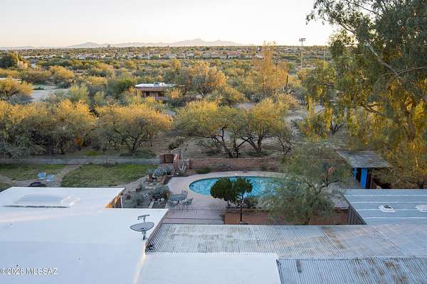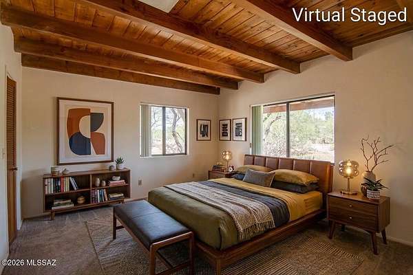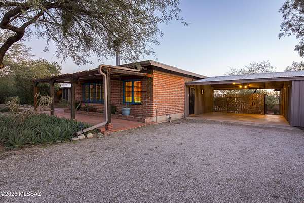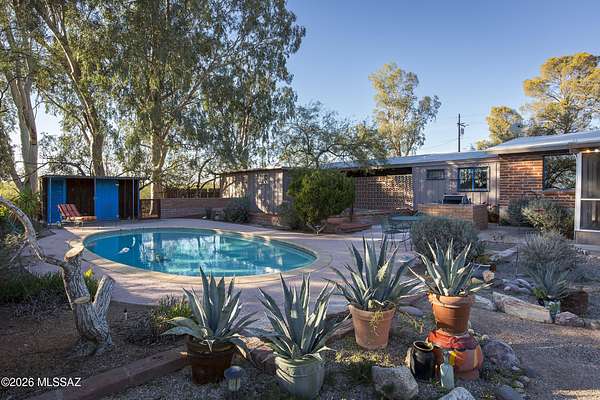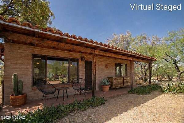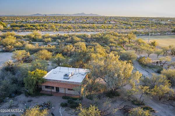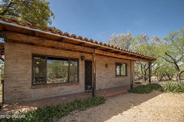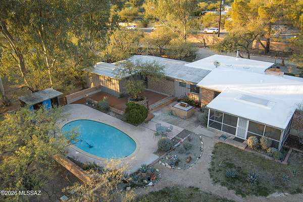 Now is the time to live your midcentury modern fantasy! This 1954 built William Hazard burnt adobe house and guest is the perfect place to show off your collection of googie gewgaws and smart retro furnishings. 4 beds/3 baths in the main, and 1 bed/1 bath in the guest. Beamed ceilings. Original wood floors. Stained concrete. Some vintage vinyl. Full of light. Perfect for entertaining. The great room is light-filled with access to the large screened in porch. Primary ensuite has its own private patio. Two other bedrooms are bright with sliding glass doors that open onto the back yard. An ideal setting for your Sonoran Desert indoor-outdoor lifestyle. The grounds are an expansive 3.41 acres with pockets of exotics surrounded by natural desert. Guest House is accessed by a short hike through the desert, or a drive down the long, long driveway. Private well. Close to central Tucson, on the foothills side of the Rillito. Walk to the river path, or perhaps ride your horses? Zoned SR, possible rezone to RX1 and add additional casitas for the ultimate family/friend compound. This unique property has so much to offer! Some virtually-staged photos are provided to prime your imagination. And you can get the real feel from your phone or computer by checking out the flythrough and virtual tour. Call your agent to come take a look and visualize what could become your reality.