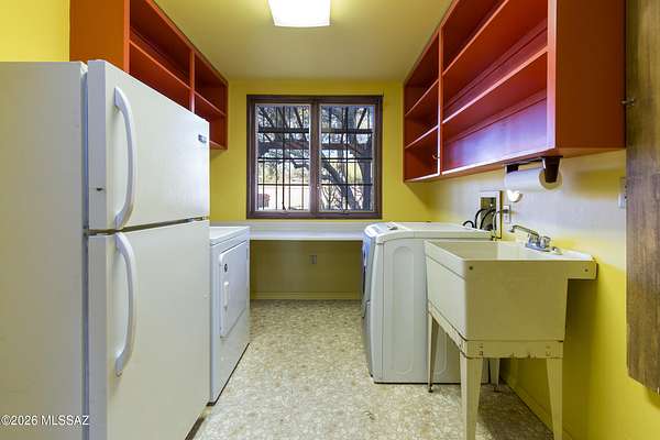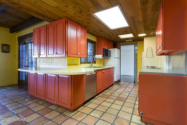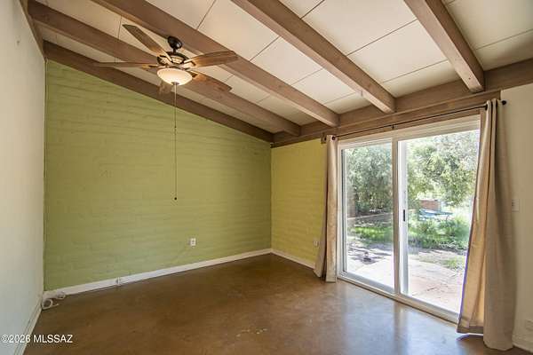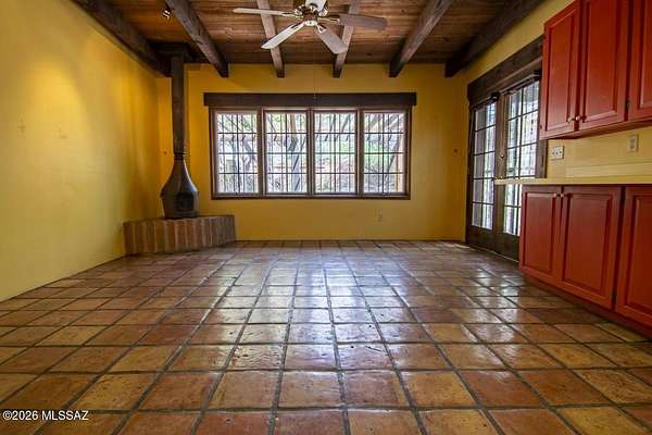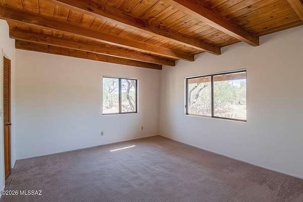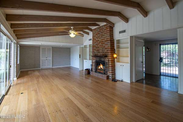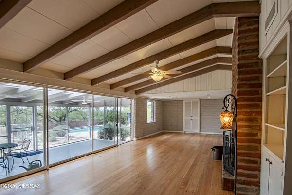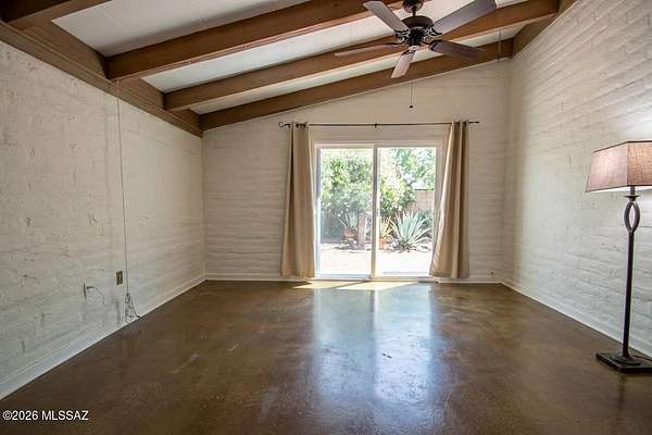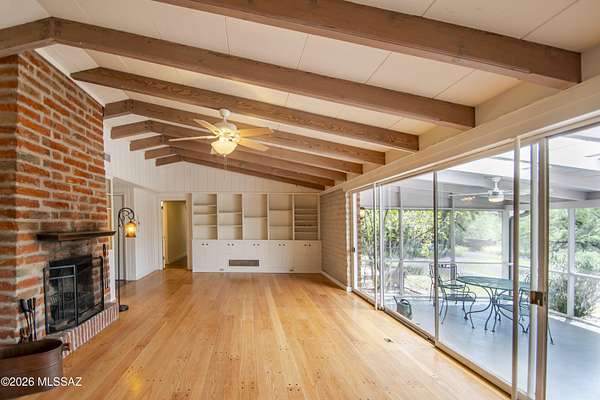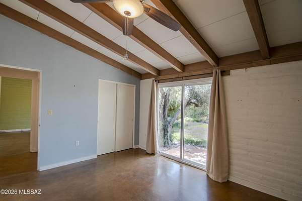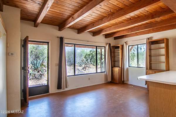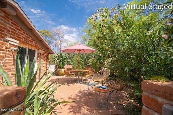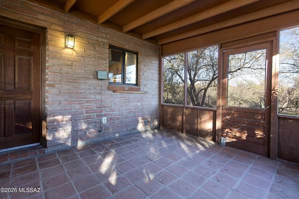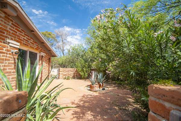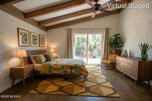 Now is the time to live your midcentury modern fantasy! This 1954 built William Hazard burnt adobe house and guest is the perfect place to show off your collection of googie gewgaws and smart retro furnishings. 4 beds/3 baths in the main, and 1 bed/1 bath in the guest. Beamed ceilings. Original wood floors. Stained concrete. Some vintage vinyl. Full of light. Perfect for entertaining. The great room is light-filled with access to the large screened in porch. Primary ensuite has its own private patio. Two other bedrooms are bright with sliding glass doors that open onto the back yard. An ideal setting for your Sonoran Desert indoor-outdoor lifestyle. The grounds are an expansive 3.41 acres with pockets of exotics surrounded by natural desert. Guest House is accessed by a short hike through the desert, or a drive down the long, long driveway. Private well. Close to central Tucson, on the foothills side of the Rillito. Walk to the river path, or perhaps ride your horses? Zoned SR, possible rezone to RX1 and add additional casitas for the ultimate family/friend compound. This unique property has so much to offer! Some virtually-staged photos are provided to prime your imagination. And you can get the real feel from your phone or computer by checking out the flythrough and virtual tour. Call your agent to come take a look and visualize what could become your reality.