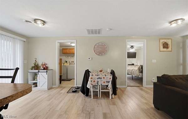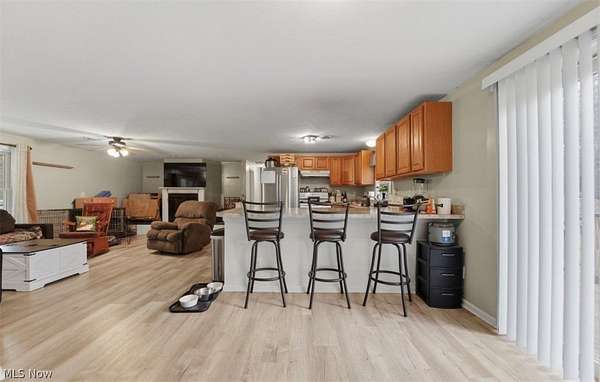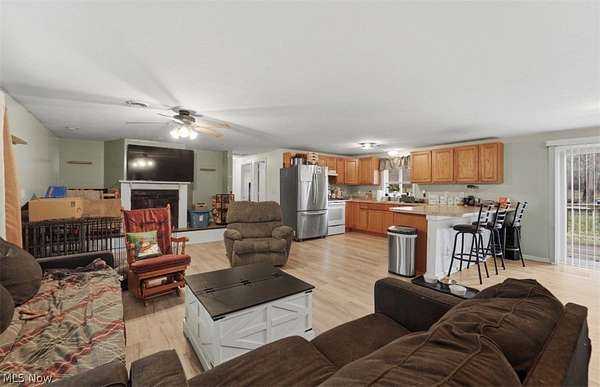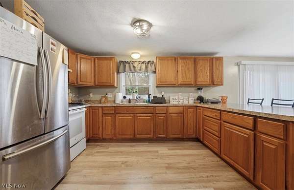Welcome to this well-maintained 3-bedroom, 2-bath ranch home located in Sheffield Township, Ashtabula County. Offering the convenience of one-floor living, this property features an open-concept layout with a spacious eat-in kitchen that flows seamlessly into the main living area, ideal for everyday living and entertaining. Sliding glass doors lead to a rear deck overlooking approximately 2.5 acres, providing a peaceful setting with plenty of room to enjoy the outdoors. A covered front porch adds additional space to relax and take in the surroundings. The home sits on a crawl space and includes a two-car attached garage for added convenience. Updates completed in 2022 include renovations to the kitchen and both bathrooms, along with updated plumbing and electrical. The metal roof is approximately 8 years old, and mechanical systems are estimated to be around 7 years old. This property offers a blend of comfort, updates, and space in a quiet township setting.
