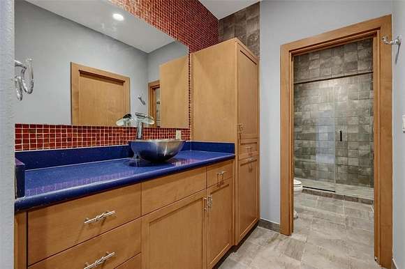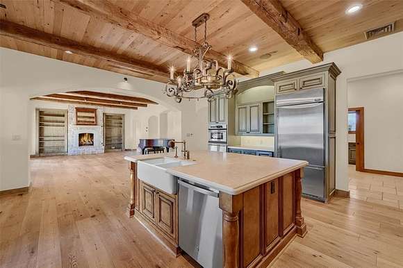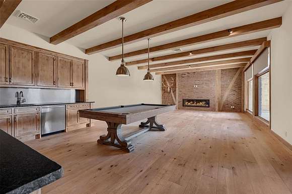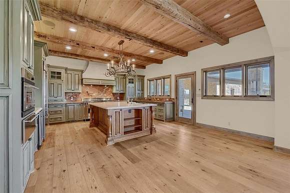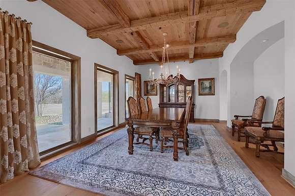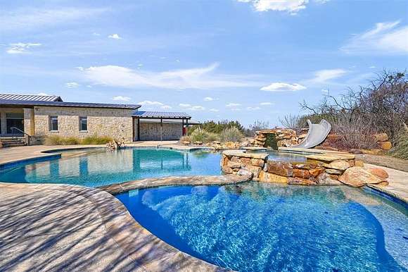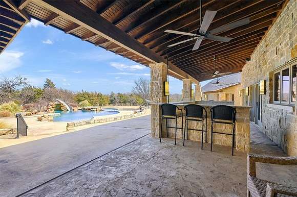 Dam, and only 2 minutes from Hwy 75! A magnificent, gated entrance welcomes you as you arrive at this stunning North Texas Ranchette with a Hill Country feel. An elegant stairway and a spacious dining room greet you in the entryway. This unique property features a gourmet kitchen with a walk-in pantry and modern appliances, leading into an open living space overlooking the large patio, outdoor area, and serene lagoon-style saltwater pool with spa and grotto. As you explore deeper into the home, you will discover an impressive media or game room, complete with a luxurious linear gas fireplace, bar area, and powder room. Various rooms, including the primary bedroom and en-suite bathroom, have automatic shades and multi-room sound systems. And just off the primary wing is a charming private dressing room. Additionally, there is a convenient poolside powder room and a self-contained cabana to accommodate guests and overnight stays. The residence not only includes a spacious safe room designed for weather emergencies but is equipped with a Nations Pure Filtration System, which provides bottled water quality. The incredibly spacious 60'x 40' insulated shop has a