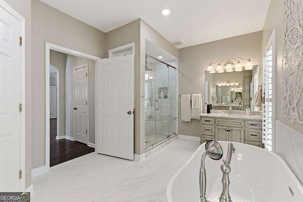 Bookcases, Double Vanity, High Ceilings, In-Law Floorplan, Master On Main Level, Separate Shower, Soaking Tub, Split Bedroom Plan, Tile Bath, Walk-In Closet(s)