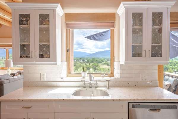 Imagine owning a house and guesthouse overlooking Taos Valley with big mountain views on 1.95 acres. This glorious home is private, yet close to town and Taos Ski Valley. From the house you can see El Salto, Pueblo Peak, and even Truchas Peak. The orientation of the house and guesthouse allow you to enjoy both sunrises and sunsets. The home was designed to take advantage of solar gain with large clerestories in two bedrooms, trombe walls on the guesthouse, metal clad wood windows, saltillo tiles ,and hardwood floors. The home is both energy efficient and welcoming. The main house has three bedrooms and two baths. The kitchen opens onto a large patio with lots of space for outdoor dining and seating. Tiered garden beds are ready to plant and there is a fenced area for your furry friends. A large covered portal welcomes visitors into the front of the home and provides shaded seating overlooking a nice lawn with trees. The guesthouse entrance is down a path from the portal area. It is nicely appointed and has quite a bit of storage with living and dining areas combined and an efficient kitchen. A full sized bathroom makes this a very livable unit. In addition the guesthouse has its own private patio area. Views and space, light and bright, sweetly located and ready to move in, this property has so much to offer.