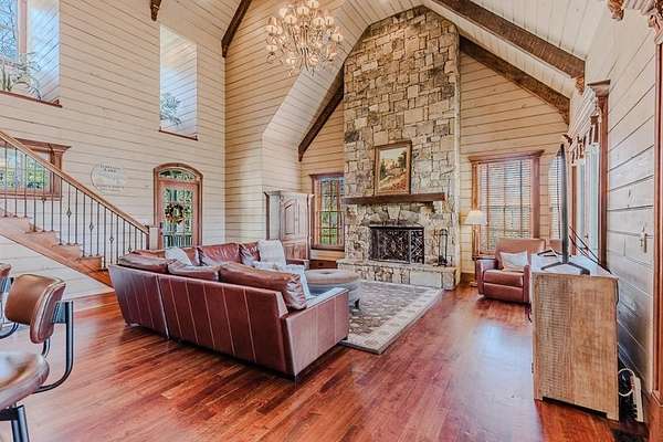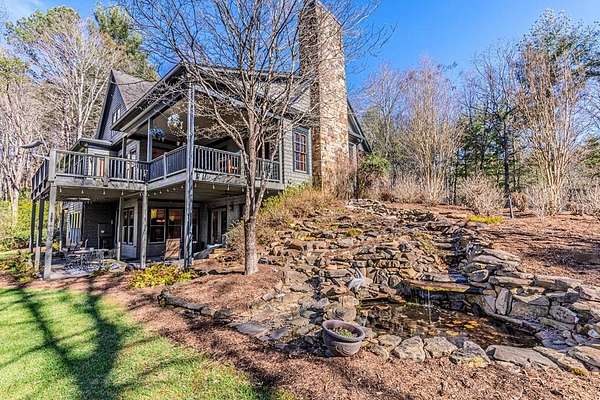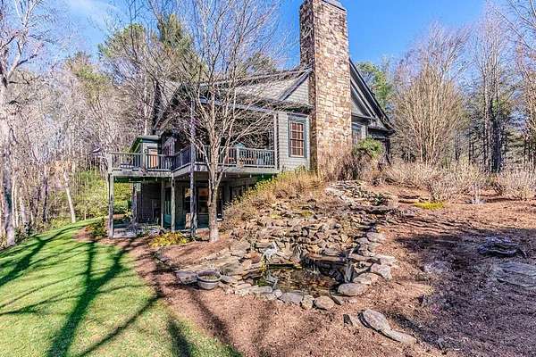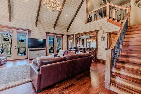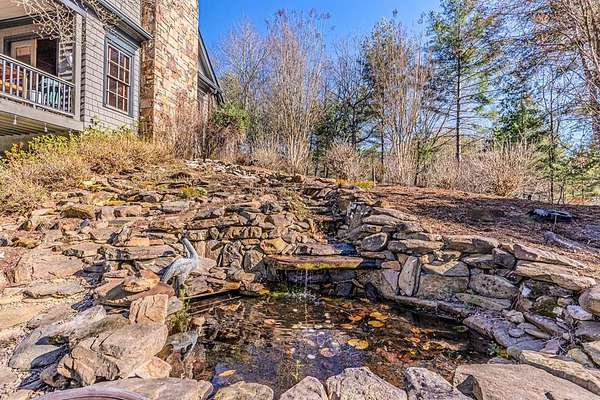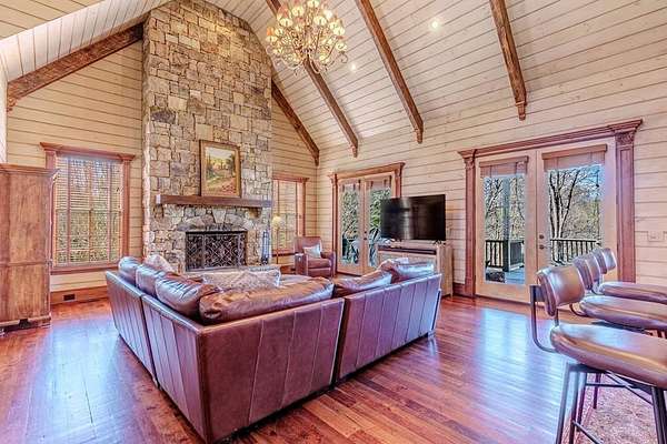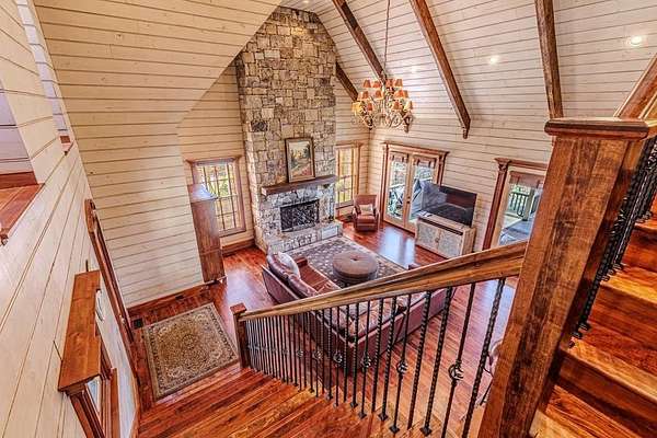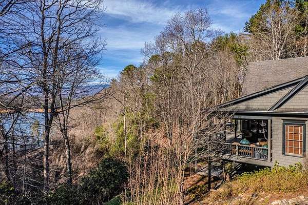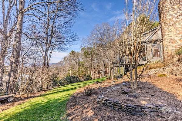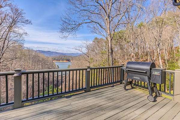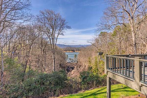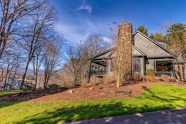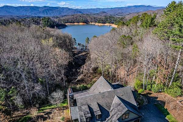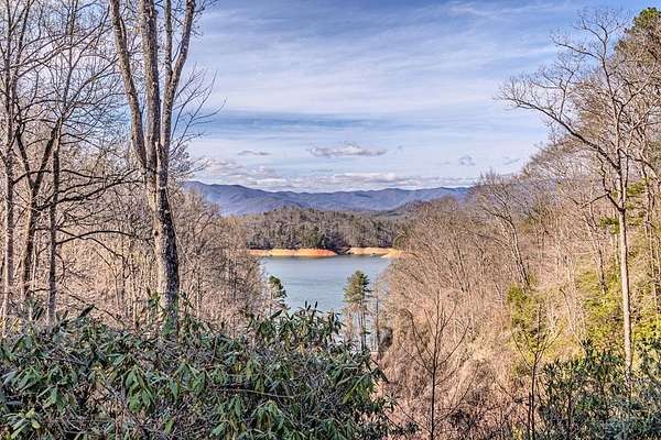 Breathtaking views of Fontana Lake and the Great Smoky Mountains surround this custom 4BR/4.5BA PLUS BONUS basement level additional bedroom. This is luxury retreat in highly sought-after Fontana Lake Estates. A level paved driveway and main-level primary suite offer convenient, easy living. A paved drive leads to a beautifully manicured yard with a recirculating waterfall—welcome to Trail's End. Inside, the great room features soaring 25-ft ceilings, a dramatic wood-burning fireplace, and hardwood floors. The gourmet kitchen offers Viking appliances, granite counters, custom cabinetry, island, and breakfast bar, opening to a dining area with built-in buffet and stunning views. The main-level primary suite includes a spa-like bath, walk-in closet, and porch access. Upstairs: 2 ensuite bedrooms, loft, and bonus room. Lower level: family room with gas fireplace, wet bar, office, 4th ensuite bedroom, and hot tub patio with outdoor projection TV. Enjoy the covered porch with incredible views. Amenities include lake access, trails, docks, pavilion, and boat/RV storage. Offered mostly furnished.