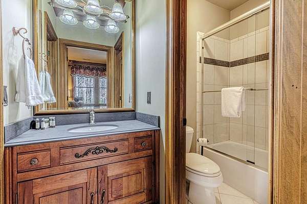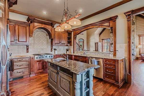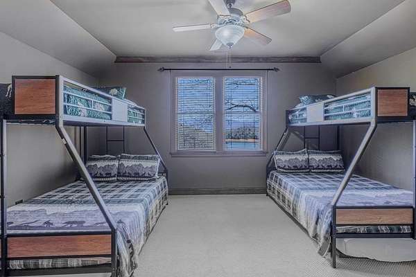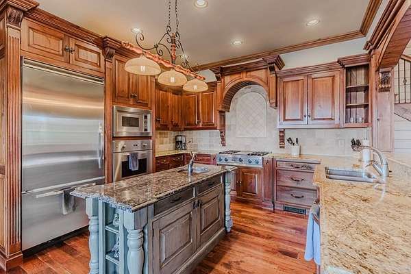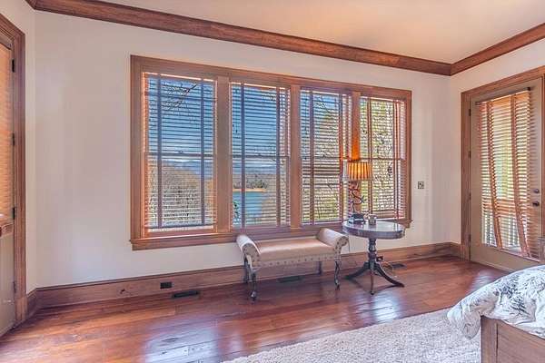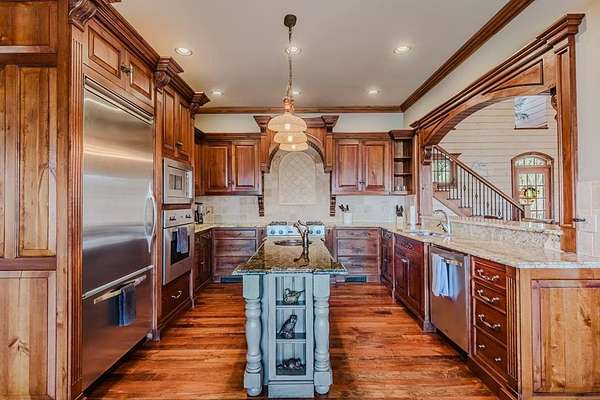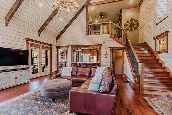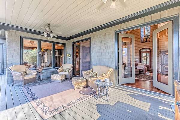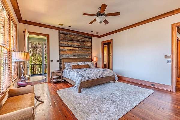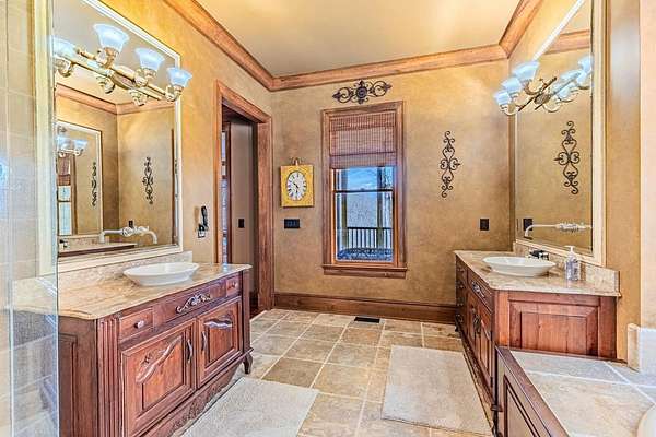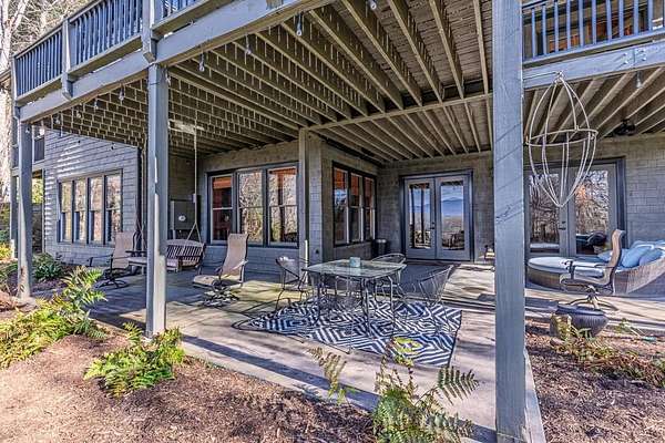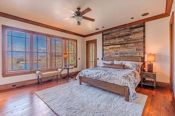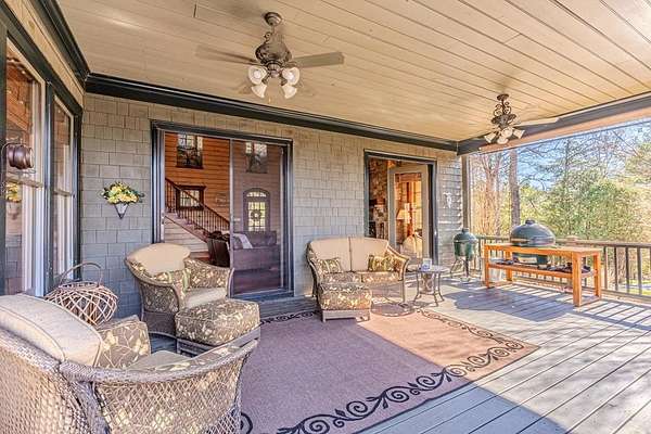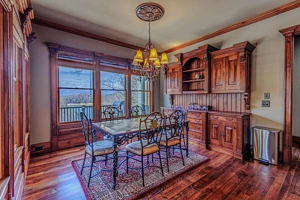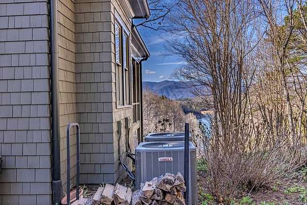 Breathtaking views of Fontana Lake and the Great Smoky Mountains surround this custom 4BR/4.5BA PLUS BONUS basement level additional bedroom. This is luxury retreat in highly sought-after Fontana Lake Estates. A level paved driveway and main-level primary suite offer convenient, easy living. A paved drive leads to a beautifully manicured yard with a recirculating waterfall—welcome to Trail's End. Inside, the great room features soaring 25-ft ceilings, a dramatic wood-burning fireplace, and hardwood floors. The gourmet kitchen offers Viking appliances, granite counters, custom cabinetry, island, and breakfast bar, opening to a dining area with built-in buffet and stunning views. The main-level primary suite includes a spa-like bath, walk-in closet, and porch access. Upstairs: 2 ensuite bedrooms, loft, and bonus room. Lower level: family room with gas fireplace, wet bar, office, 4th ensuite bedroom, and hot tub patio with outdoor projection TV. Enjoy the covered porch with incredible views. Amenities include lake access, trails, docks, pavilion, and boat/RV storage. Offered mostly furnished.
