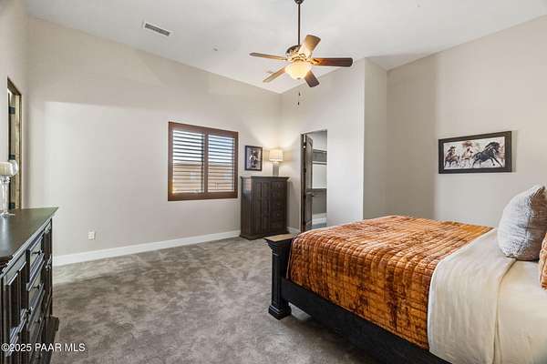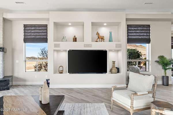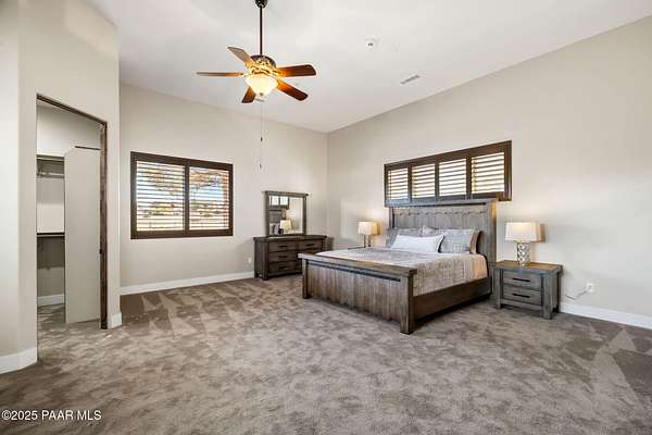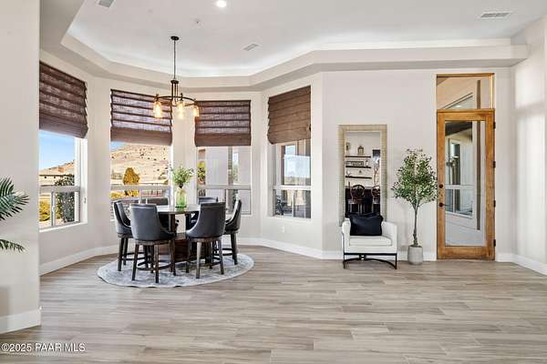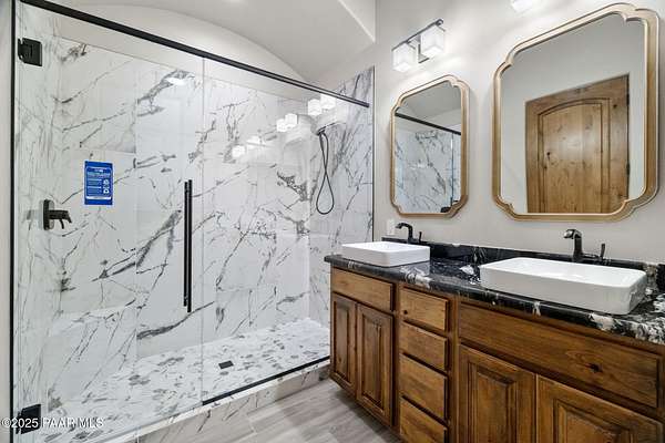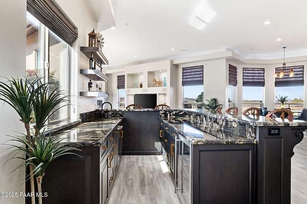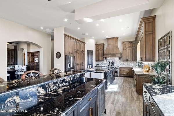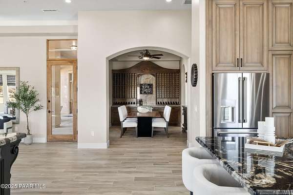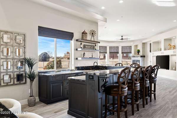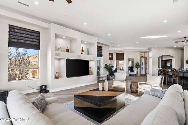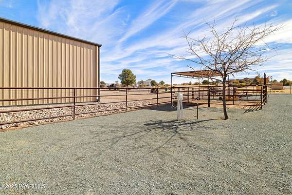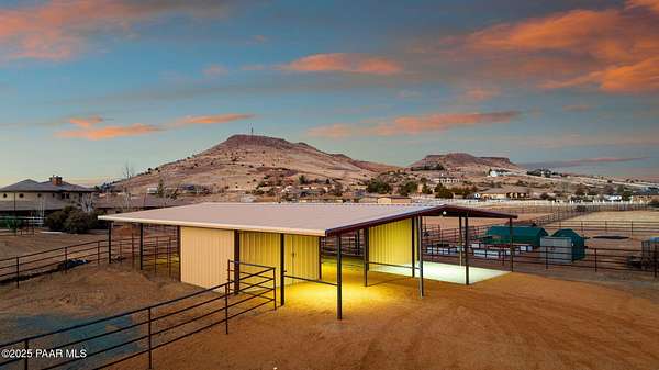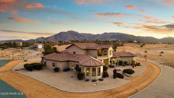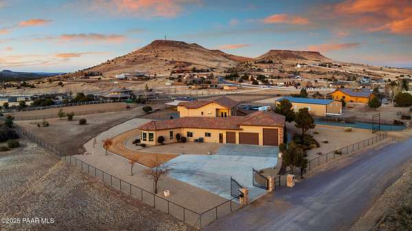Stunning country estate blends luxury living with world-class equestrian facilities. Fully remodeled &privately gated, it offers breathtaking views of Mingus & Granite Mountains. Set on 3.69 fully fenced acres, 7,150 sq. ft. featuring 5 beds, 5 3/4 baths, soaring ceilings, plank tile flooring, custom cabinetry, 234-bottle wine wall, built-in bar, & RV garage. Primary suite is a retreat w/ fully updated bath. Addl- 4 3/4 are all fully remodeled Outdoor amenities include a pro-level roping arena, 3,200 sq. ft. barn with a mare motel, five 16x16 stalls, large tack room w/ a hidden 10' door, & three RV hookups w/ water, electricity & horse stalls. Arena features roping boxes, chute, sand-packed surface, cattle area w/ sorting gates & feeding stations. Rare luxury ranch in a prime Arizona setting!