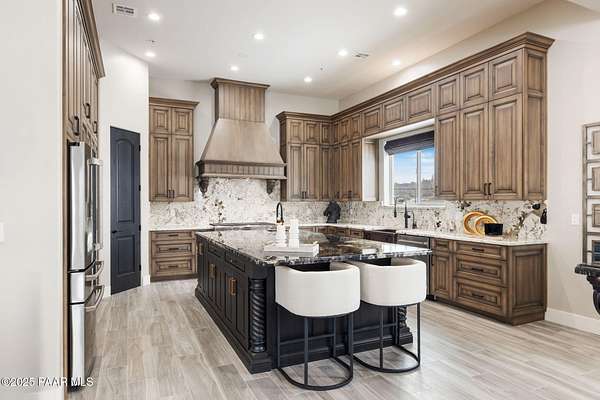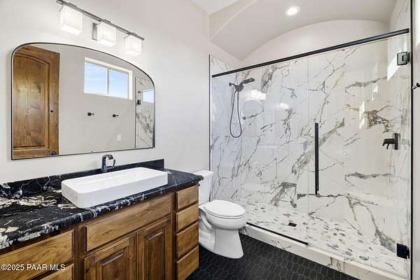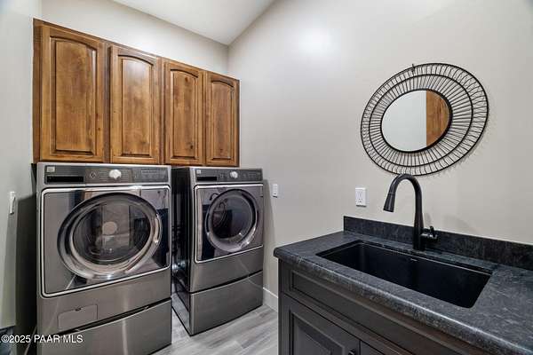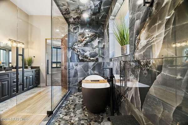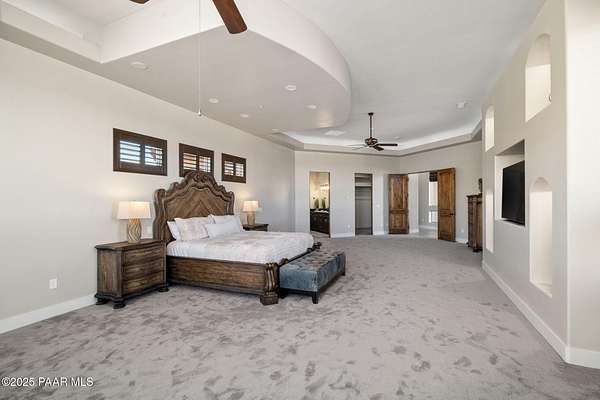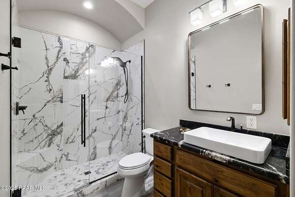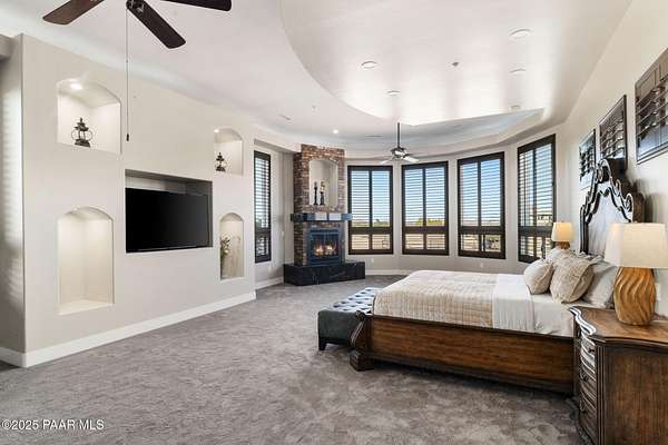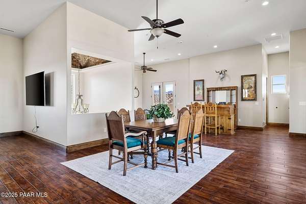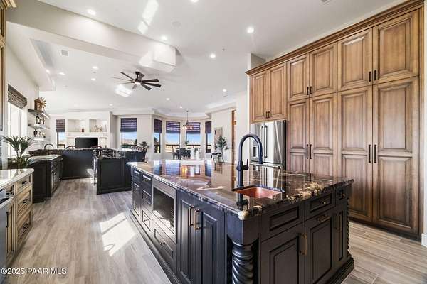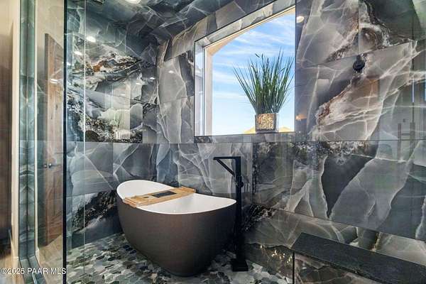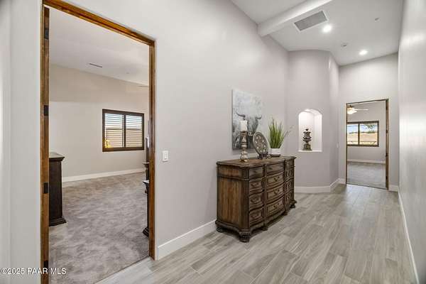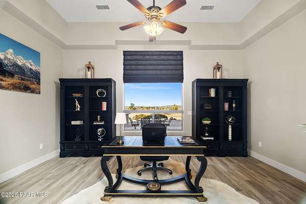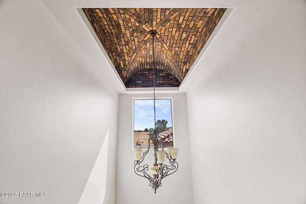 Stunning country estate blends luxury living with world-class equestrian facilities. Fully remodeled &privately gated, it offers breathtaking views of Mingus & Granite Mountains. Set on 3.69 fully fenced acres, 7,150 sq. ft. featuring 5 beds, 5 3/4 baths, soaring ceilings, plank tile flooring, custom cabinetry, 234-bottle wine wall, built-in bar, & RV garage. Primary suite is a retreat w/ fully updated bath. Addl- 4 3/4 are all fully remodeled Outdoor amenities include a pro-level roping arena, 3,200 sq. ft. barn with a mare motel, five 16x16 stalls, large tack room w/ a hidden 10' door, & three RV hookups w/ water, electricity & horse stalls. Arena features roping boxes, chute, sand-packed surface, cattle area w/ sorting gates & feeding stations. Rare luxury ranch in a prime Arizona setting!