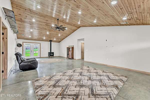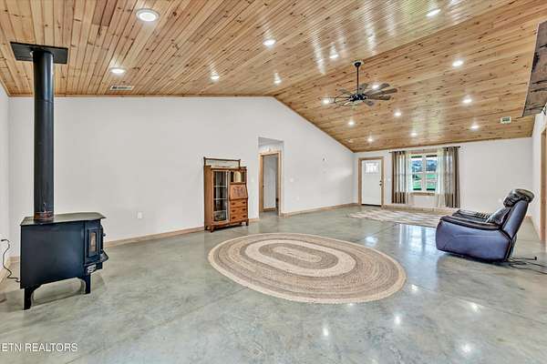 Live your country dreams in this charming 3-bedroom, 2-bath ranch home situated on over 50 acres (including a creek!) in picturesque Speedwell. Located just 5 miles to Norris Lake and 2 public boat docs! This inviting property features stunning large covered half wrap-around porches, perfect for enjoying serene views. Step inside to discover an open living space bathed in natural light, highlighted by a cozy wood-burning stove and a striking natural wood pitched ceiling.