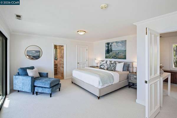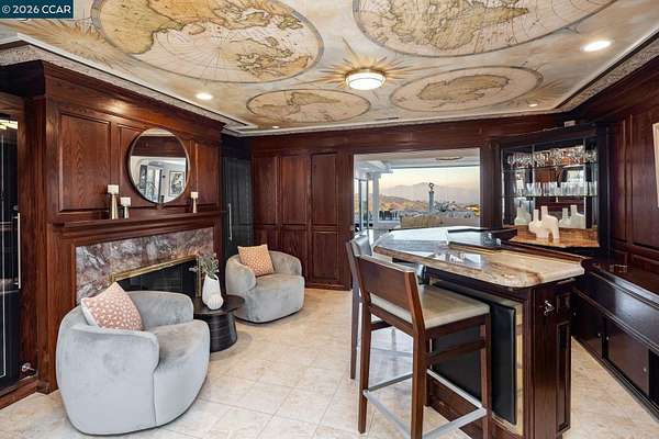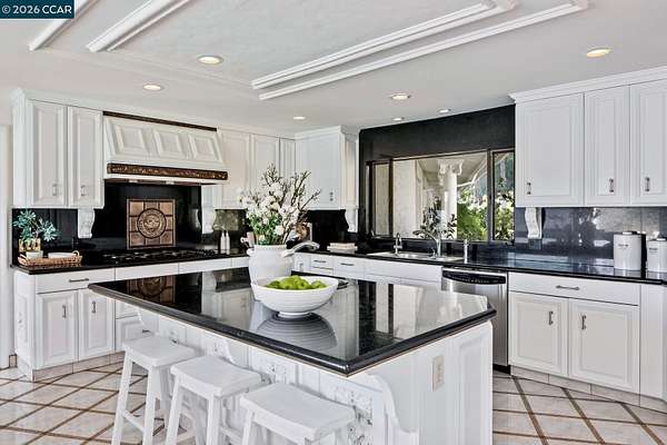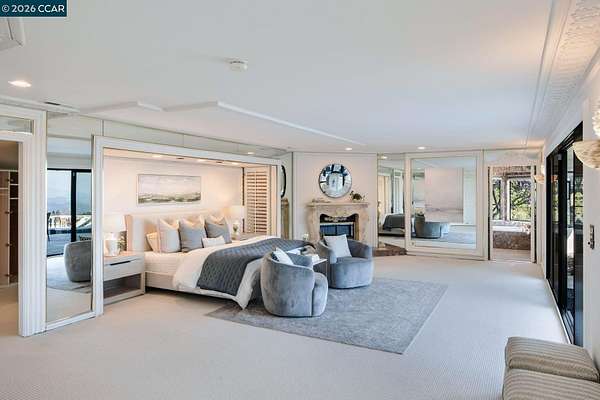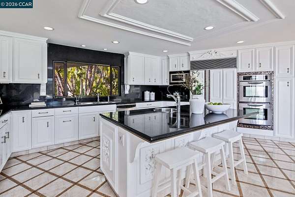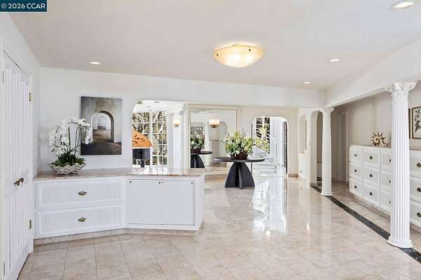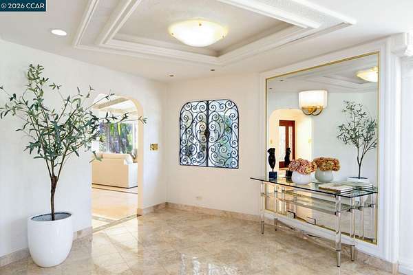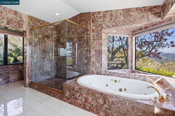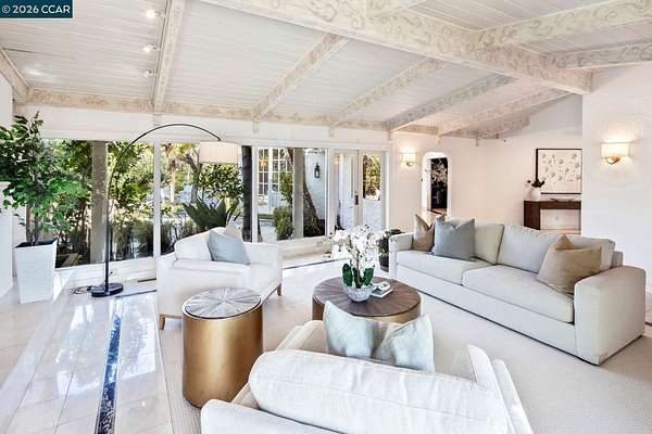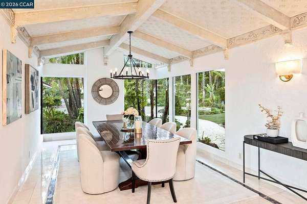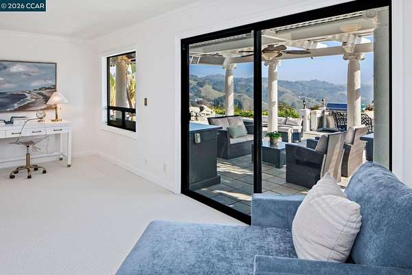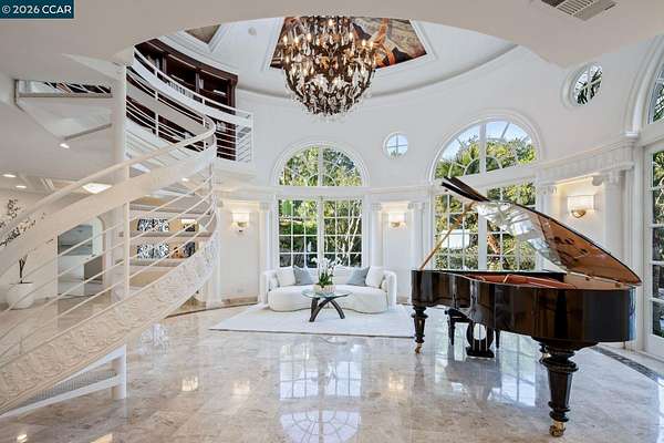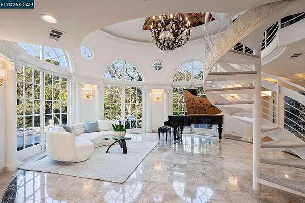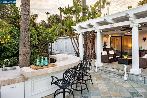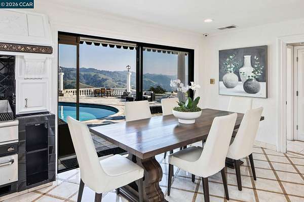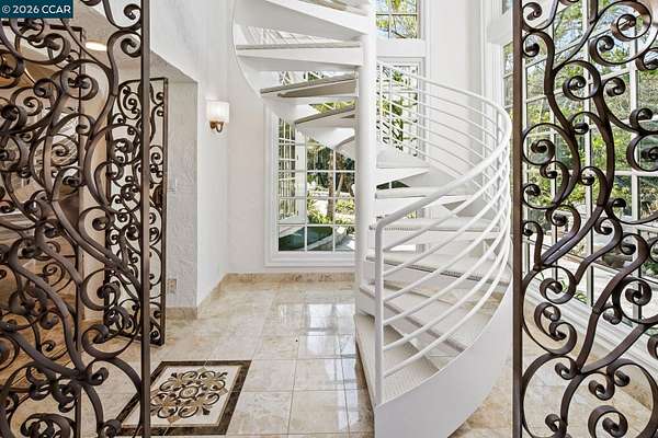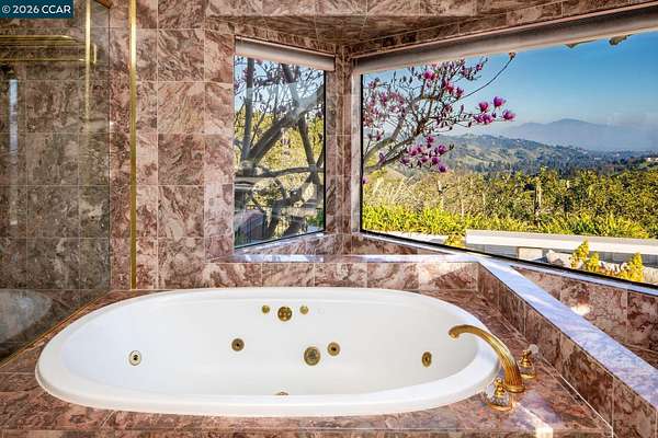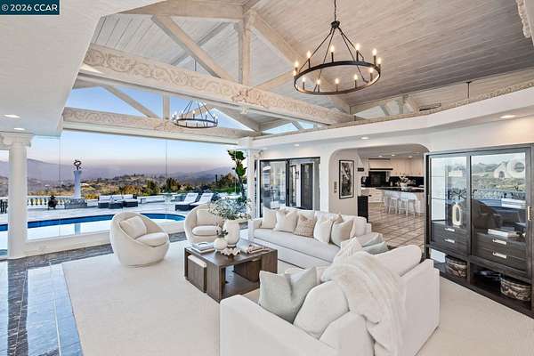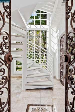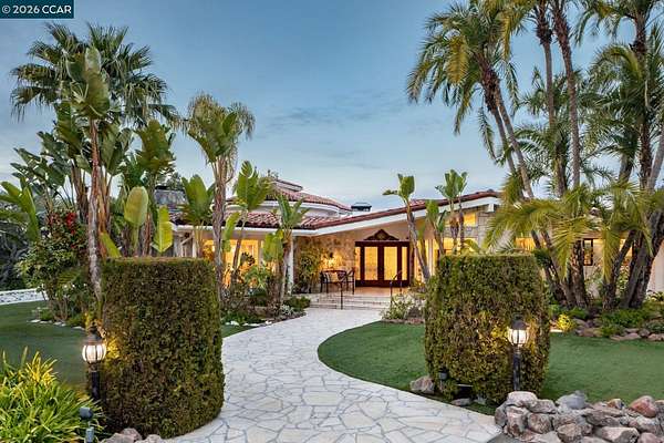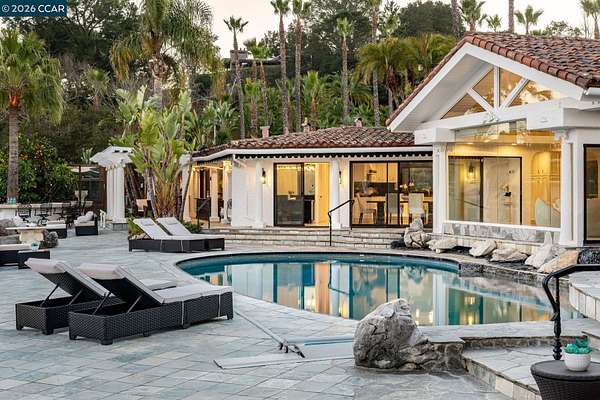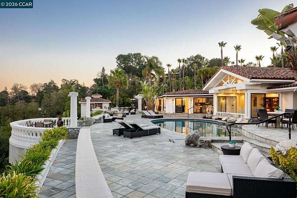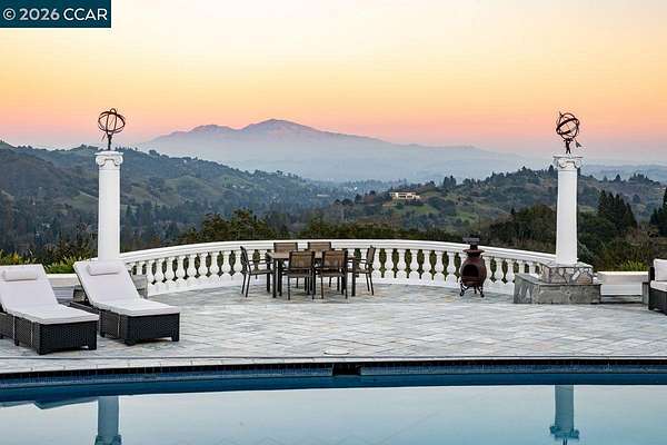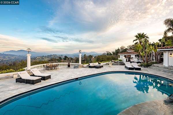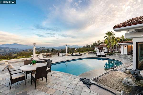 Secluded in the hills of Upper Happy Valley, this Mediterranean villa is a private world of resort-style living, amid landscaped grounds framed by sweeping Mt Diablo views. The estate feels worlds away, yet is minutes from downtown Lafayette. Walls of glass frame panoramic mountain vistas. The elegant bar room evokes a club's ambiance. The dining room, with a beamed ceiling and seating for up to 12, flows into the rotunda, a room ideal for cocktail gatherings. Nearby, a spiral staircase leads to an impressive office suite, with 4 chandeliers, windows on 3 sides and Mt Diablo views. The chef's kitchen offers elite appliances, custom counters, fine cabinetry and a breakfast nook. The family room features a 7x12-foot projection screen. The principal suite commands sweeping views of the deck, pool and Mt Diablo. Another bedroom is a second principal suite, secluded for privacy. One of the 2 additional bedrooms opens directly to the garden: fountains, tropical landscaping, a sport court and massive deck. The adjacent guest house can be used as a yoga studio, gym, or bedroom suite. The outdoor bar seats 6 beside a DCS grill, and a hot tub is in a secluded deck corner. The tile roof is beautiful and fire resistant, and the fire station is just down the hill.