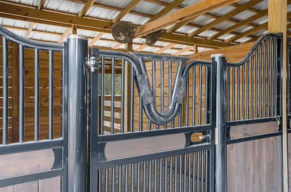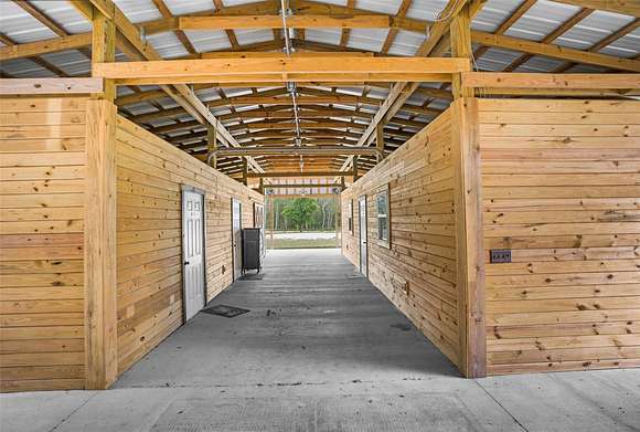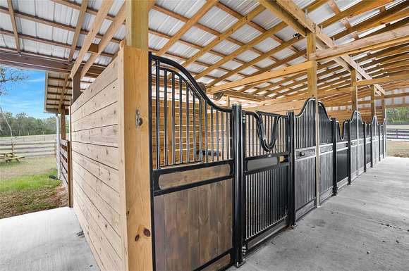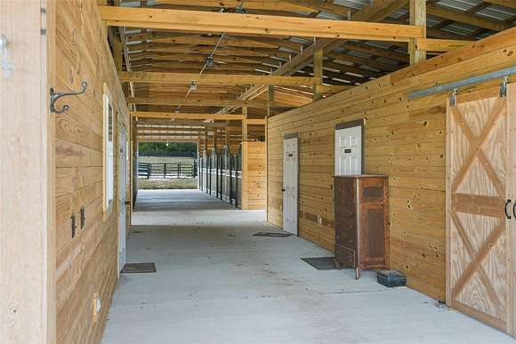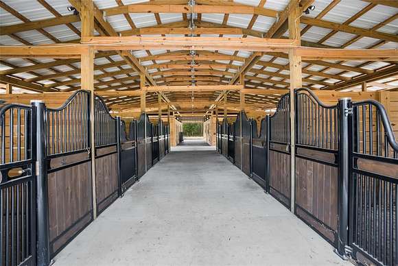 BARN: The best part of the property! This new custom-built barn was designed by an equine professional and looks like it belongs in Wellington. 8 stalls in the center-aisle barn, each is 12' x 12' with a 24' covered run-out. Dutch doors on the back of the stalls can be kept open to allow access to the run-outs or closed. Each stall has a 4" thick stall mattress. So comfortable! Imported European stall fronts with swing-out feed doors and optional U-shaped yokes to put in the stall door for stallions. Water piped to each run-out, eliminating the need for carrying and filling water buckets. Only agriculture sealed-motor fans are used in the barn. The cross tie area has hot/cold water and a hose boom to keep the hose off of the floor. The barn has its own water softener, septic tank, hot/cold water in every room, and A/C in every room. The hay area holds up to 9 pallets of hay, with Dutch doors in the aisle and a garage door in the back for deliveries. Full bathroom with toilet, sink, shower, washer, dryer, and water heater. The feed room has a commercial stainless-steel sink and matching table for feed prep. The tack room is 12' x 36' and could easily be converted into an apartment. Tack room has a new fridge, sink, custom-built cabinets, and granite counter tops. Epoxy flooring in feed room, bathroom, and tack room. New gutters. Recessed lighting in every room, beautiful outdoor lights all down the barn aisle, spot lights in each stall, motion-sensor lights on exterior, waterproof lights in cross tie areas, and a chandelier. EXTRAS: 8 oversized raised garden beds, fruit tree, and custom-built chicken coop. Acres of fenced pastures, individual paddocks, and a paddock track system. All new wood fencing with walk-throughs in paddocks. Oversized run-in shelter, shipping container with garage doors for extra storage, and 2 extra stalls outside. Extra-large 80' round pen, outdoor cross ties, and 150' x 200' riding area. Water and electric hook-up added for an RV or LQ horse trailer.